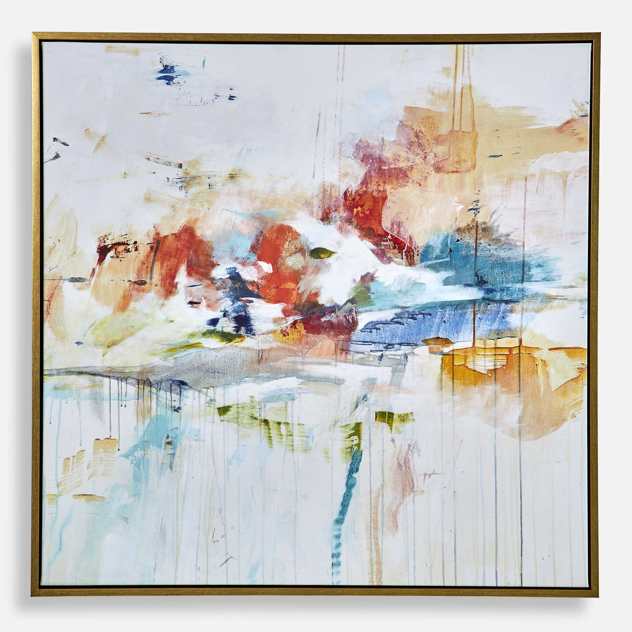 Giclee On Canvas, This Abstract Piece Features Splashes Of Orange, Red, And Blue Highlighted By A Cream Background. A Solid Wood Gallery Frame With Gold Finish Completes The Artwork. May Be Hung Horizontal Or Vertical. Each Canvas Is Proudly Handcrafted And Printed In The USA. Artwork By Lisa Ridgers.