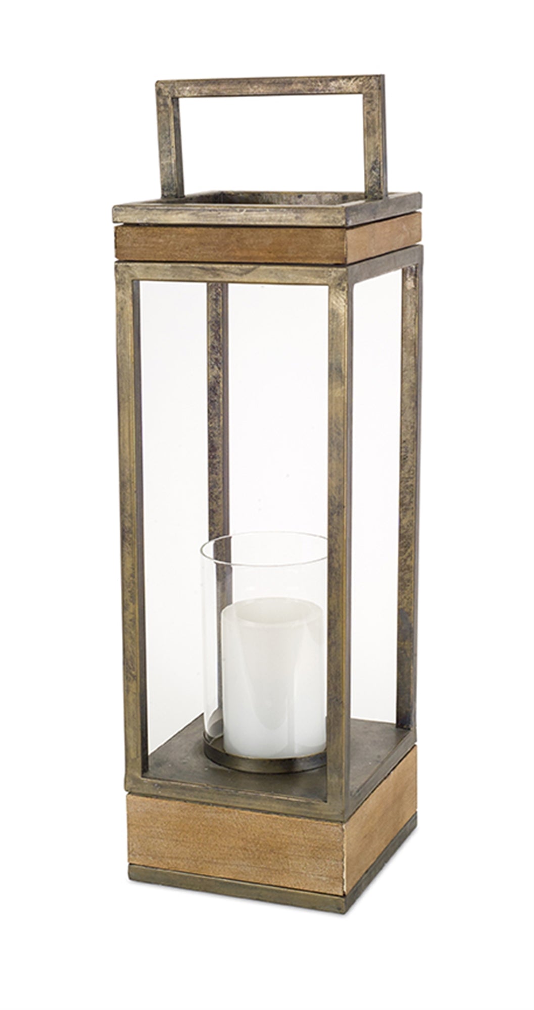 Lantern. Effortless lanterns bring casual sophistication to any setting. Rustic metal and wood framework features a glass hurricane. Vented, allowing use of real candles or our ever-popular LED timer candles, all sold separately.
