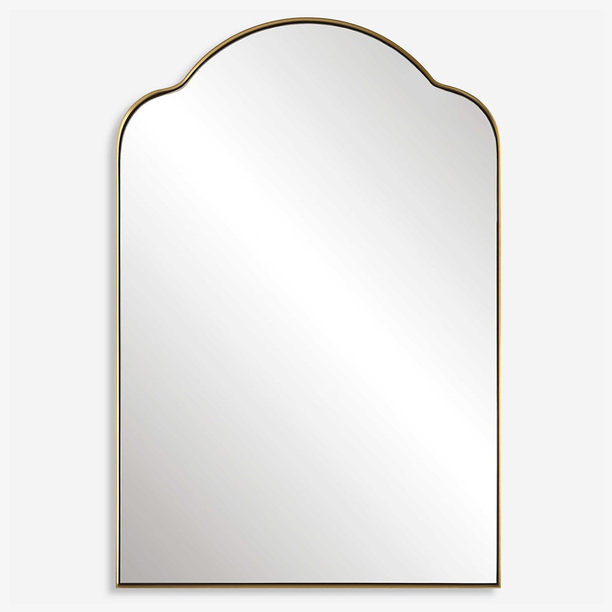 The Sidney Arch Showcases A Gracefully Curved Silhouette With A Plated Brushed Brass Finish Over A Stainless Steel Frame, Surrounding A Floating Polished Edge Mirror.