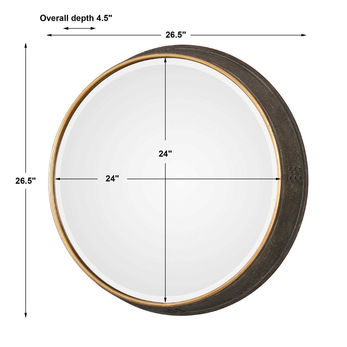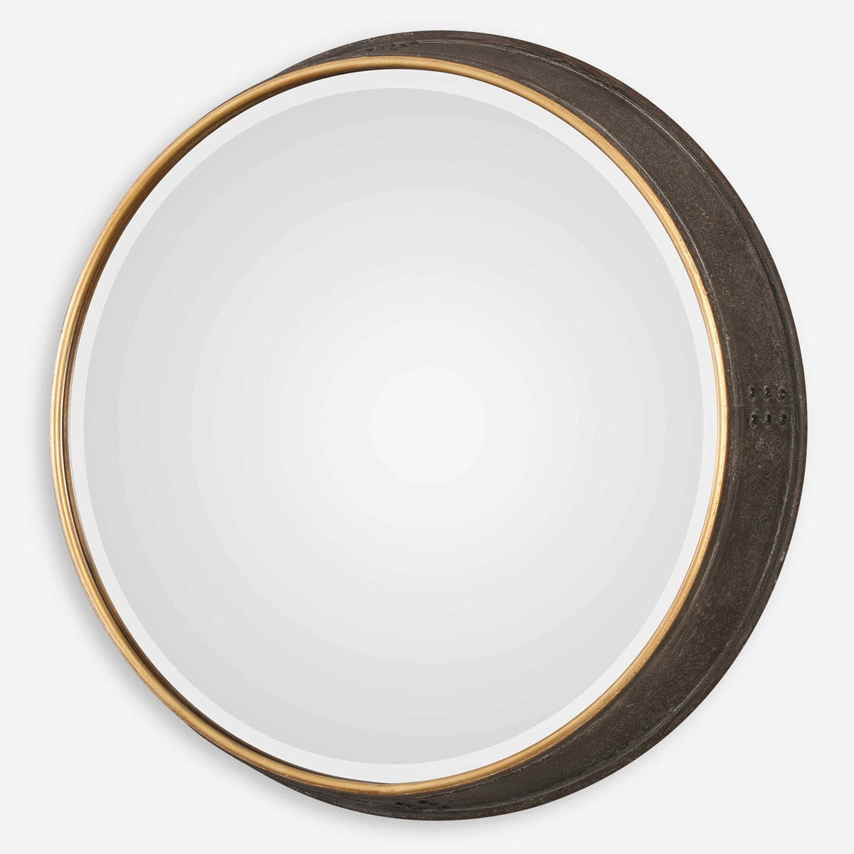 This Iron Frame Features A Petite, Antiqued Gold Front Edge, Paired With Tapered Deep Side That's Finished In A Rustic Dark Bronze With A Rottenstone Wash And Exposed Nail Heads. Mirror Features A Generous 1 1/4" Bevel.