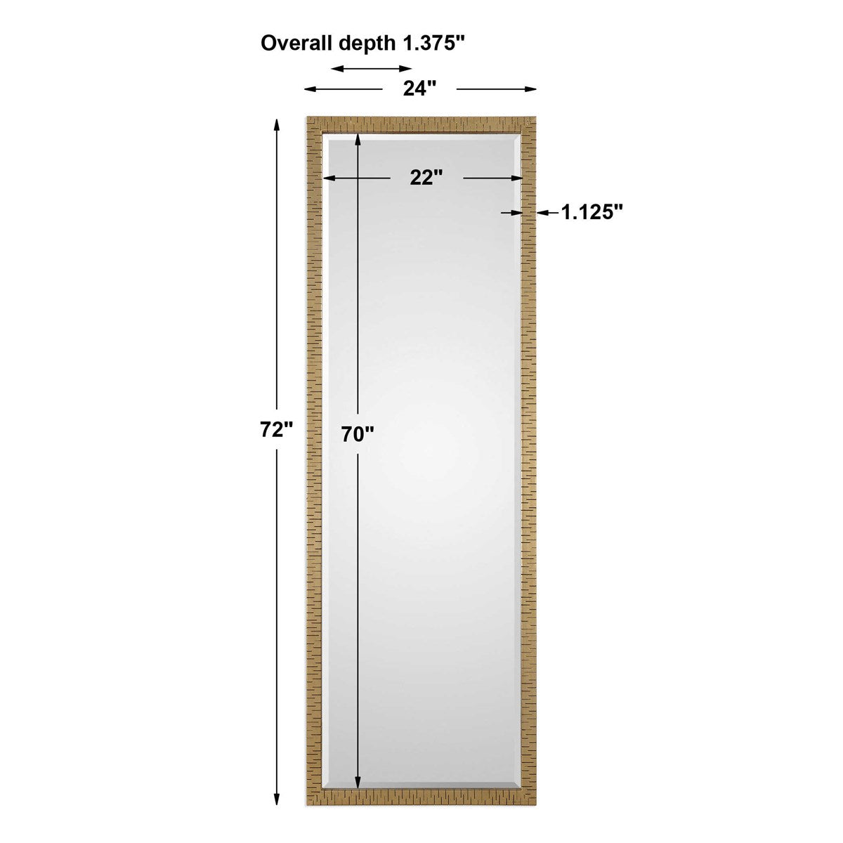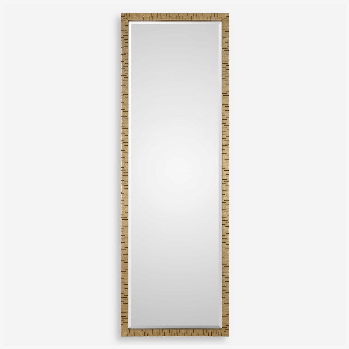 Thick Iron Frame Featuring Alternating Laser Cut Grooves, Finished In A Lightly Antiqued, Metallic Gold Leaf. Mirror Has A Generous 1 1/4" Bevel And May Be Hung Horizontal Or Vertical.