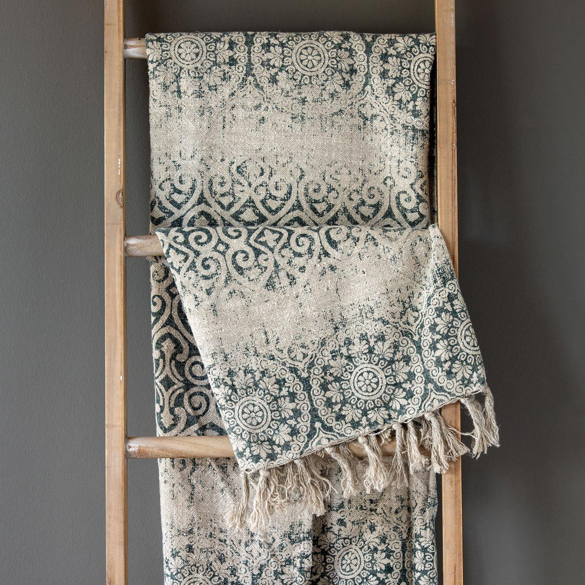 Crafted from a cotton-linen blend with a vintage-inspired print in indigo, this throw is finished with fringe on both ends. Perfect to cozy up under on a cool spring evening. Has a matching pillow. Also available in Faded Coral and Soft Gray colorways.