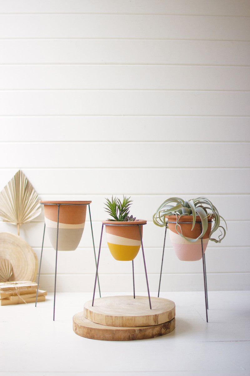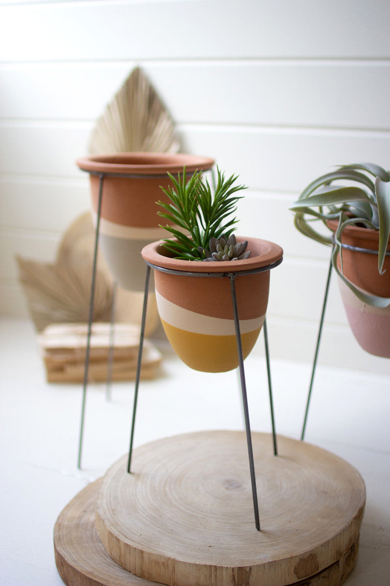 Set of 3 double-dipped clay pots on wire stands