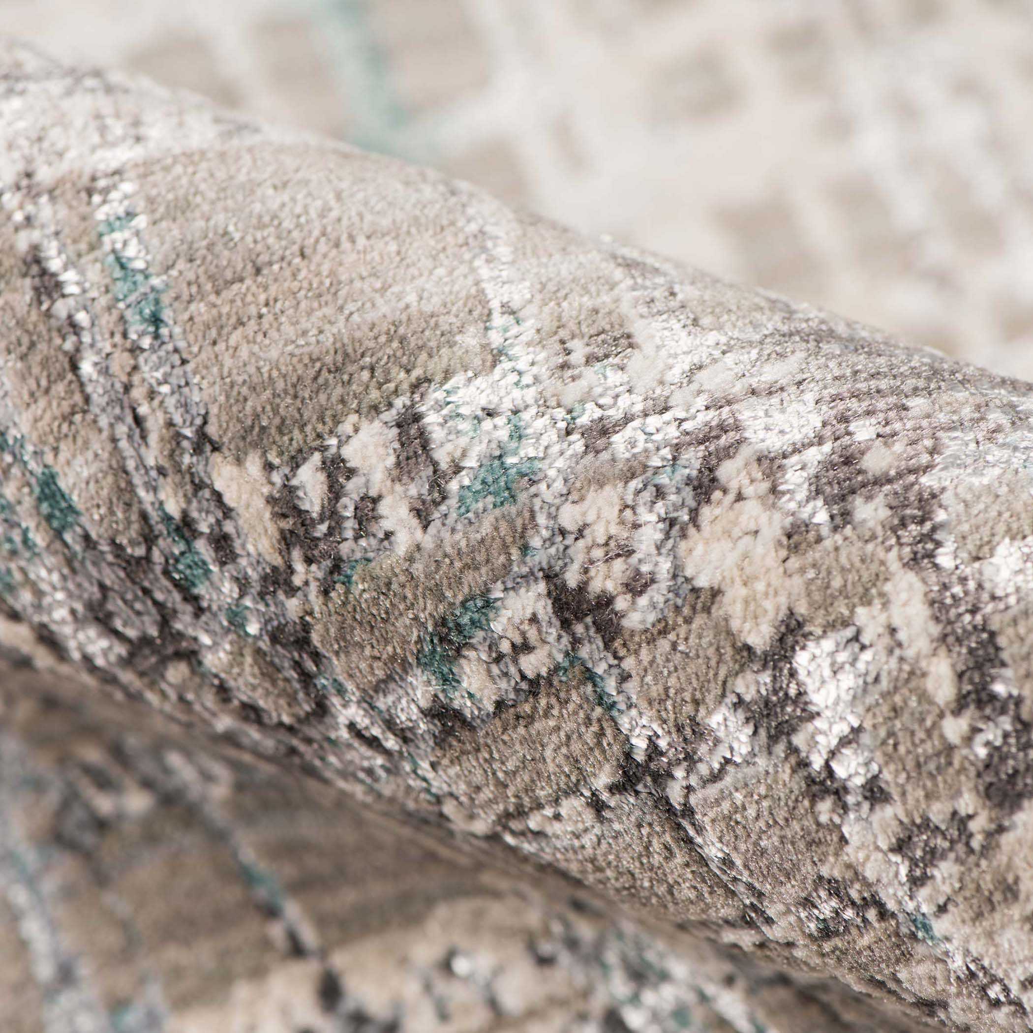 This Power Loomed Rug Features An Abstract Design In Tones Of Polyester Gray, And Beige, With Teal Blue Accents And Hints Of Charcoal.