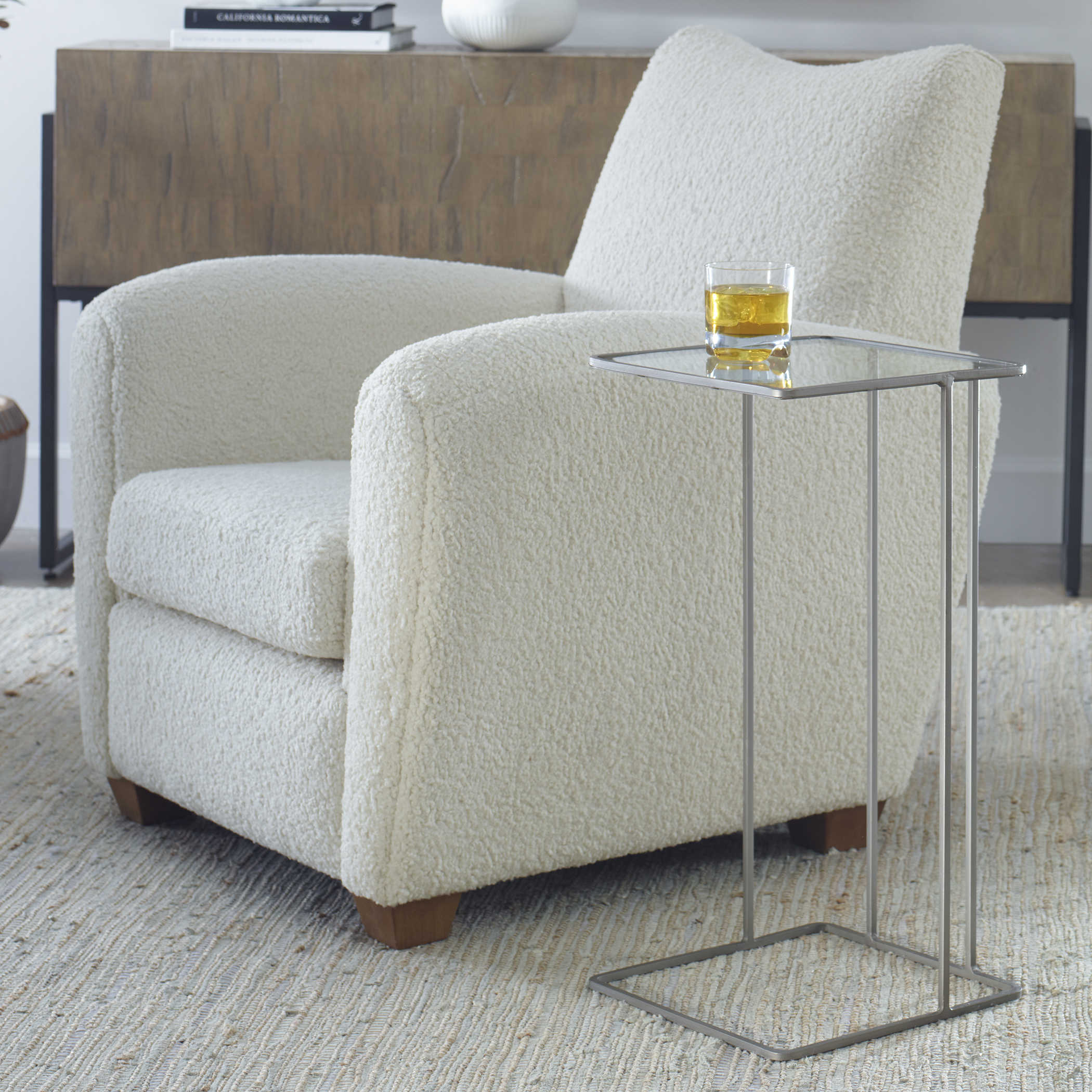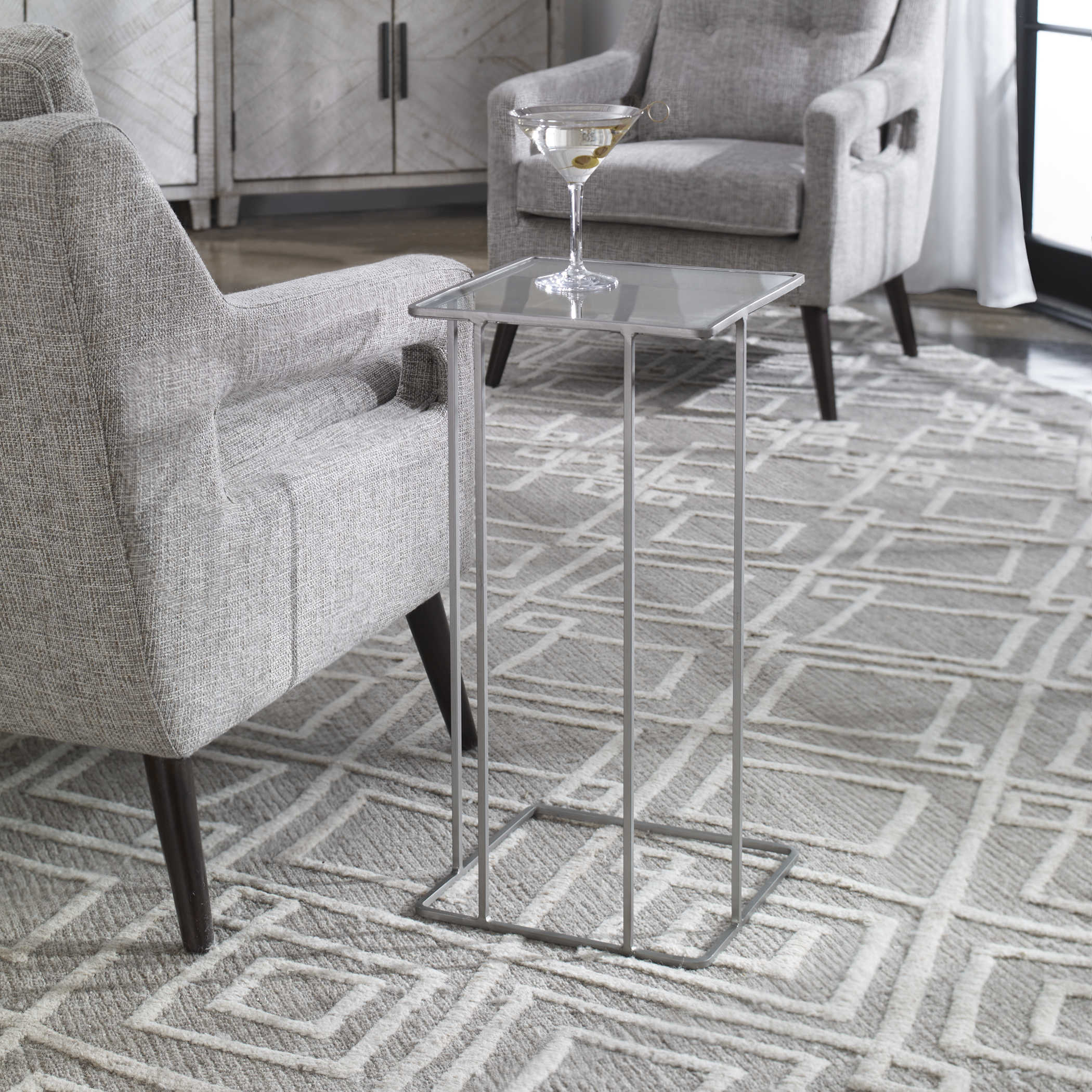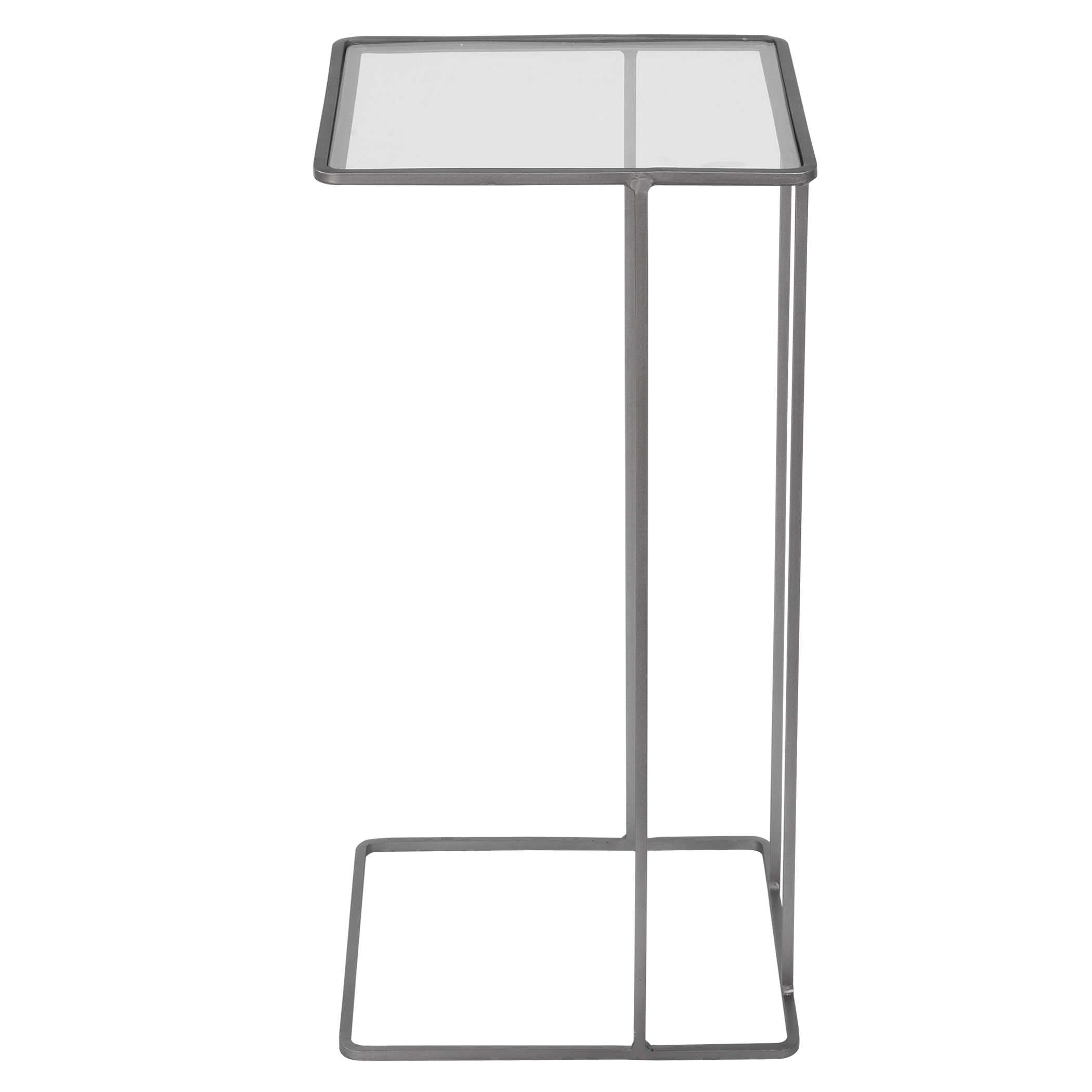 Minimally Designed With Versatility, This Petite Hand Forged Iron Accent Table Is Finished Soft Pewter With A Clear Tempered Glass Top.