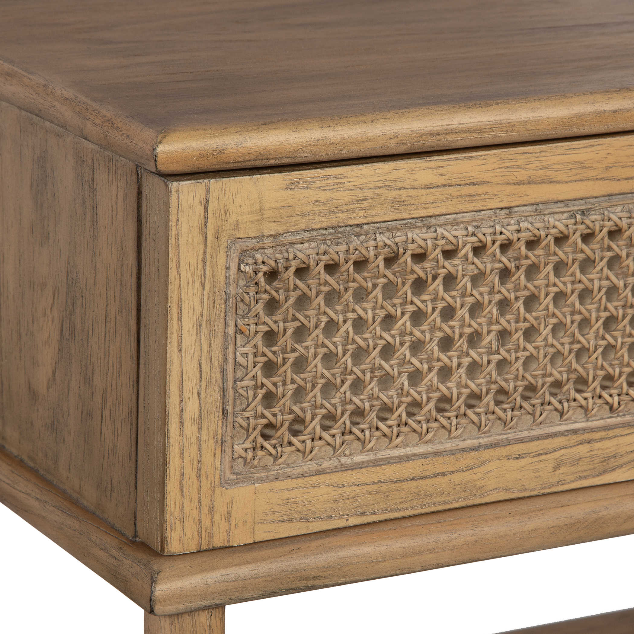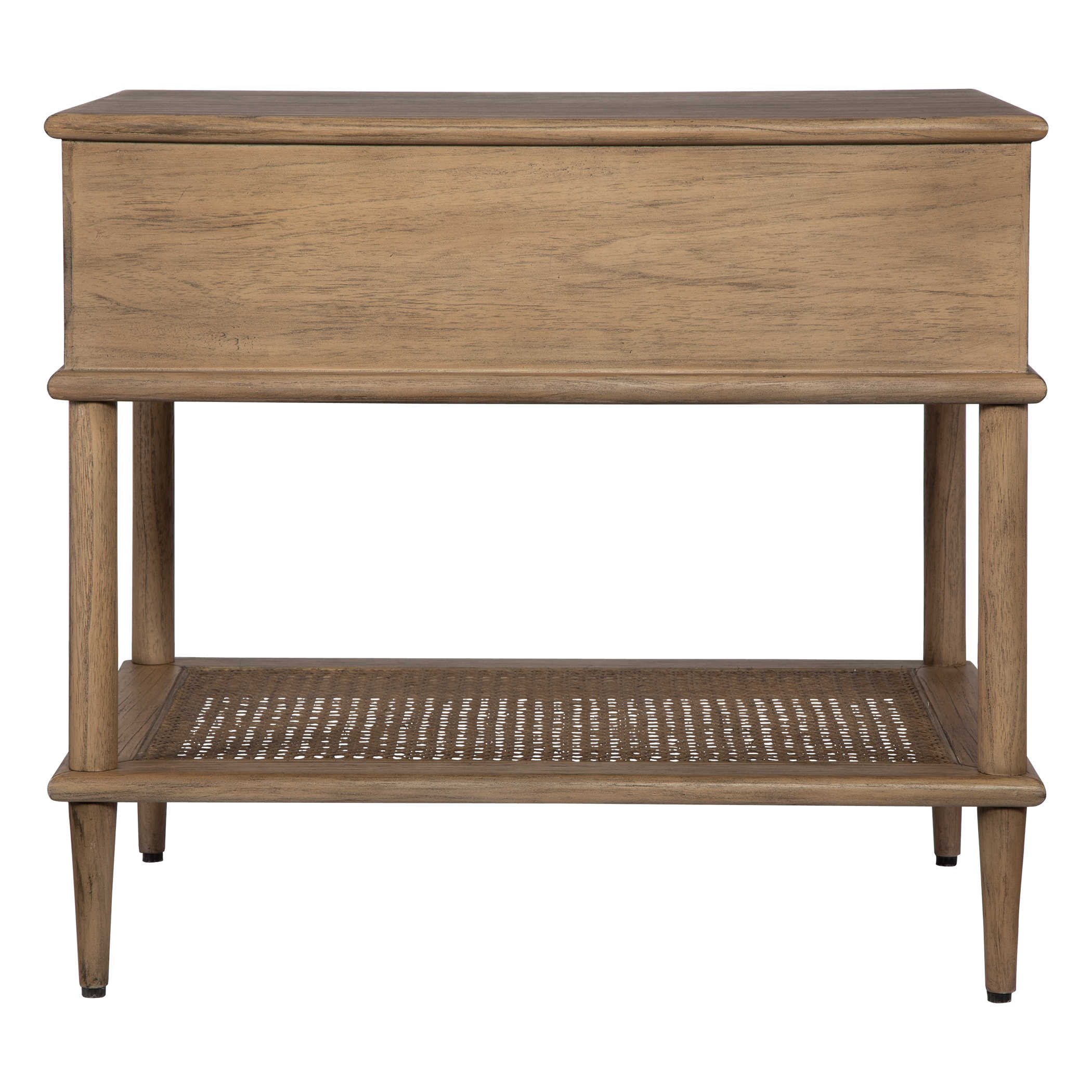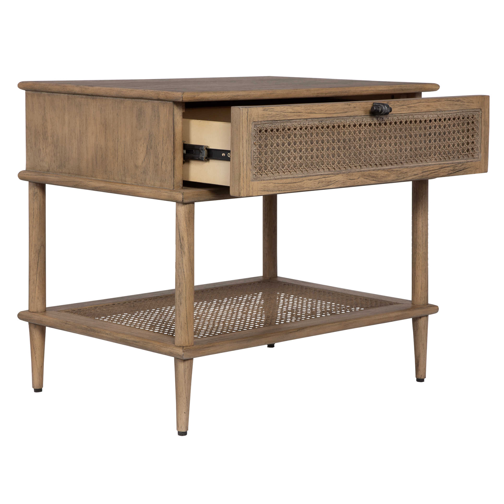 Mid Century Inspired With Accents Of Natural Rattan Cane, This Side Table Features Mindi Solids And Veneers Finished In A Soft Oak Stain. Has One Storage Shelf And Drawer With Metal Hardware In Dark Gunmetal.