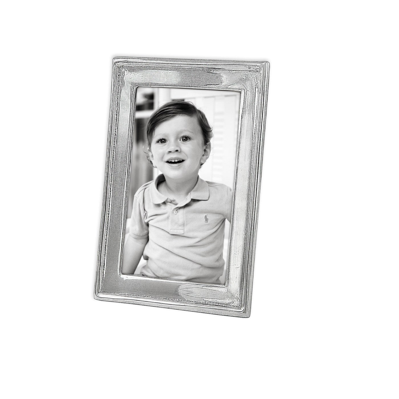 The handsome Jason frame of hand-polished metal enhances your favorite 4x6 vertical photo, and makes a brilliant statement when displayed on the mantle, desk, or shelf. From our GIFTABLES Collection featuring handmade and artfully designed items at irresistible prices. Makes a luxurious gift for any occasion. The footed, self-standing frame makes a fine wedding gift, or for any special occasion, and is an elegant solution whenever a frame is called for. Sandcast and hand-finished, the frame is made of an easy-care aluminum alloy that never needs polishing. Tarnish free.
