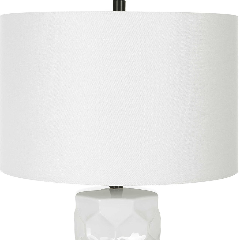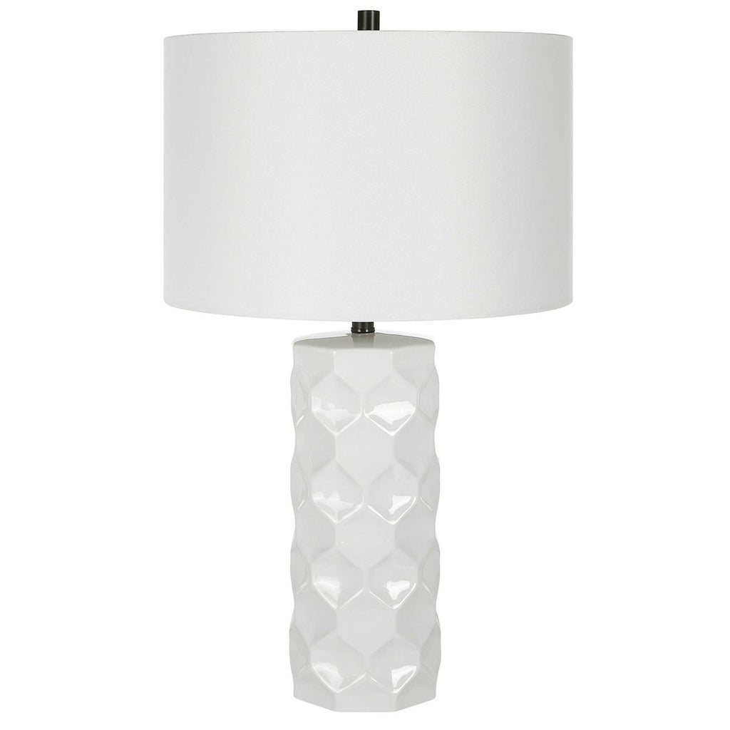 The Honeycomb Table Lamp Is Handcrafted From Ceramic In A Geometric Design Finished In A Gloss White Glaze, Accented With Satin Black Iron Details. The Hardback Drum Shade Is Covered In A White Linen Fabric.