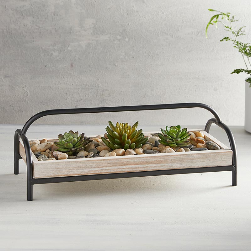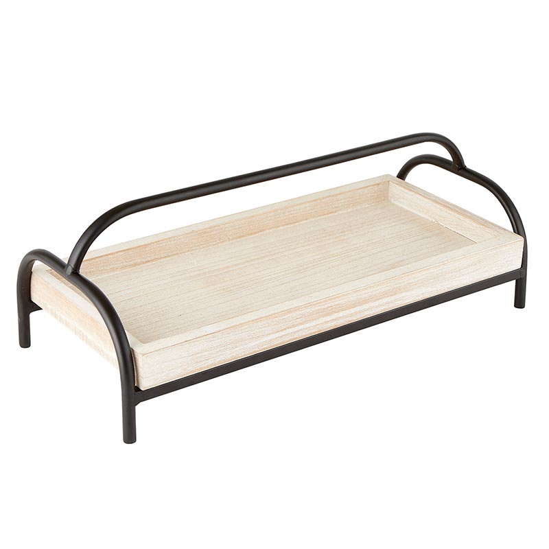 This holder features a wooden bed with a metal frame for blended natural and modern farmhouse look.