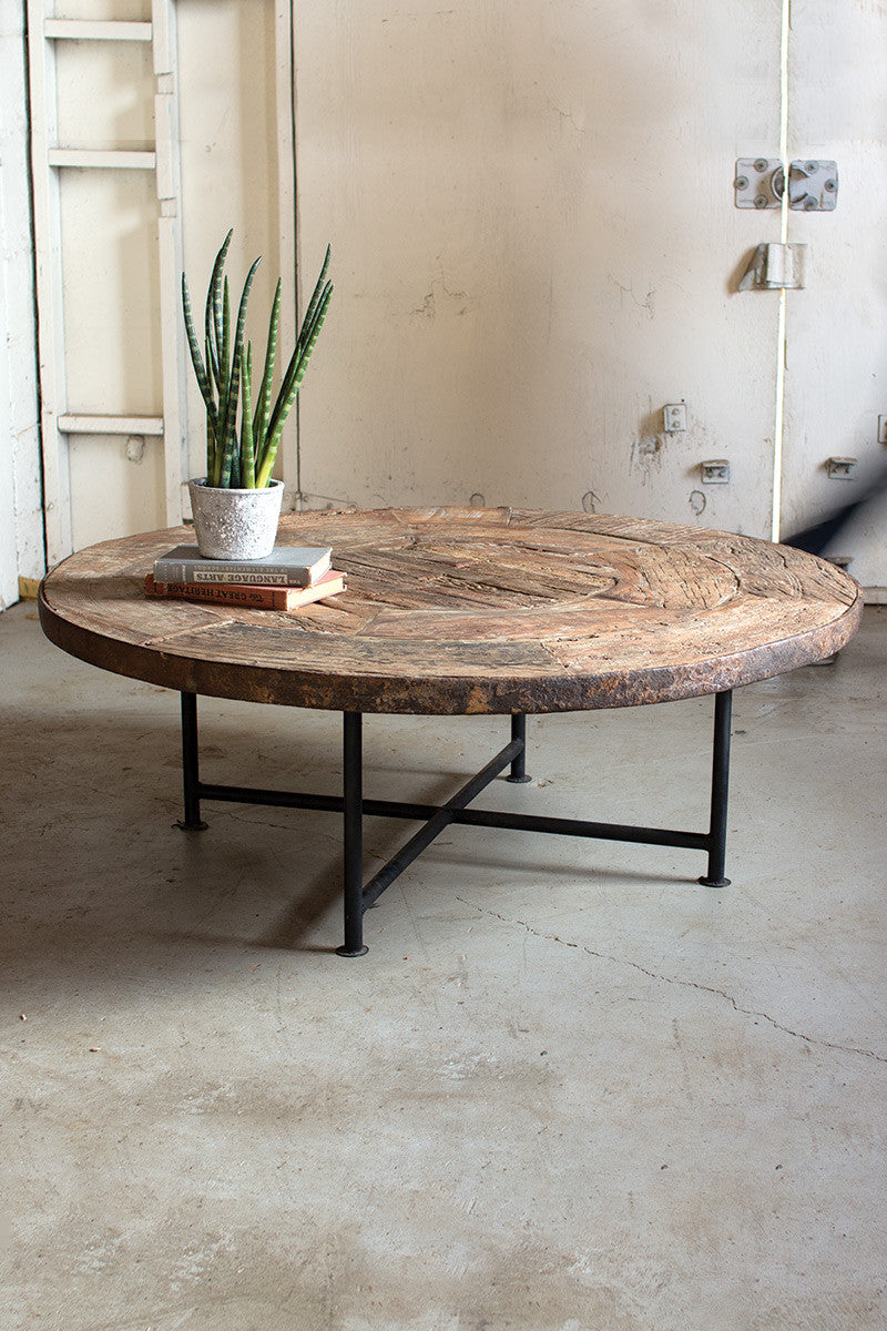 Antique wooden wagon wheel coffee table with iron base.