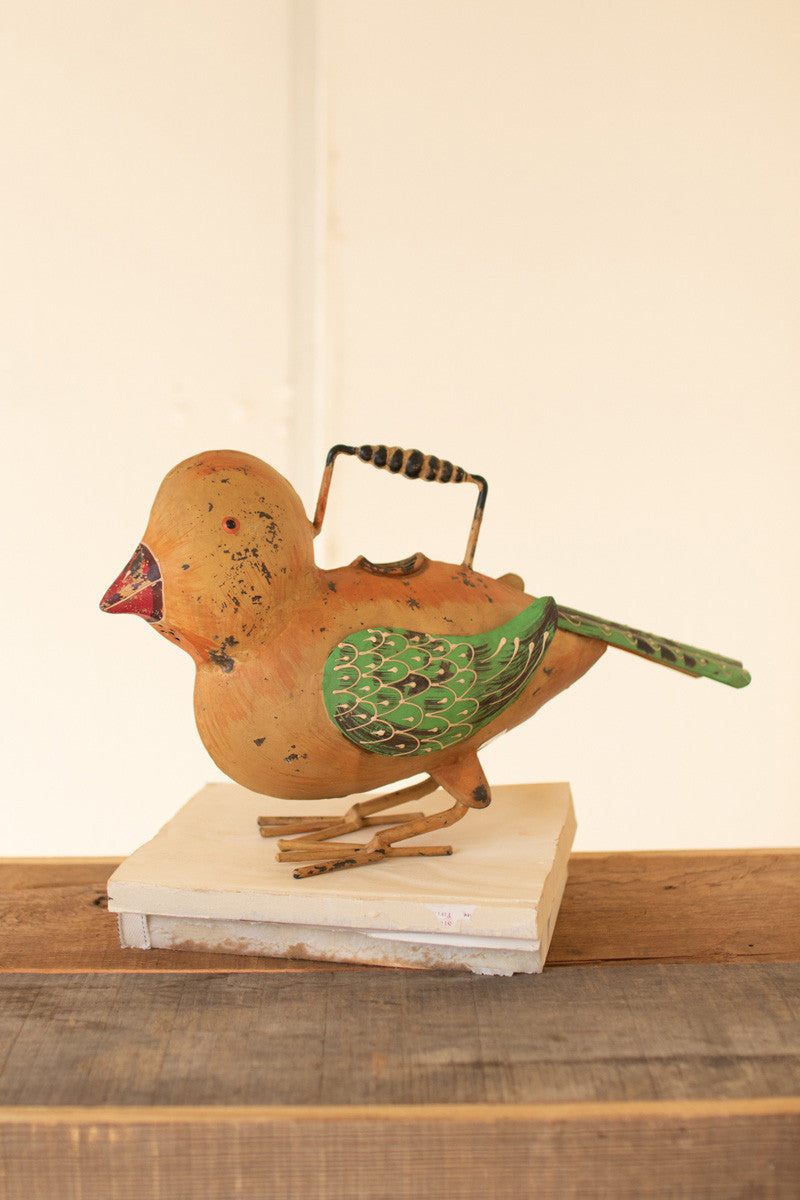 Painted iron yellow bird watering can.