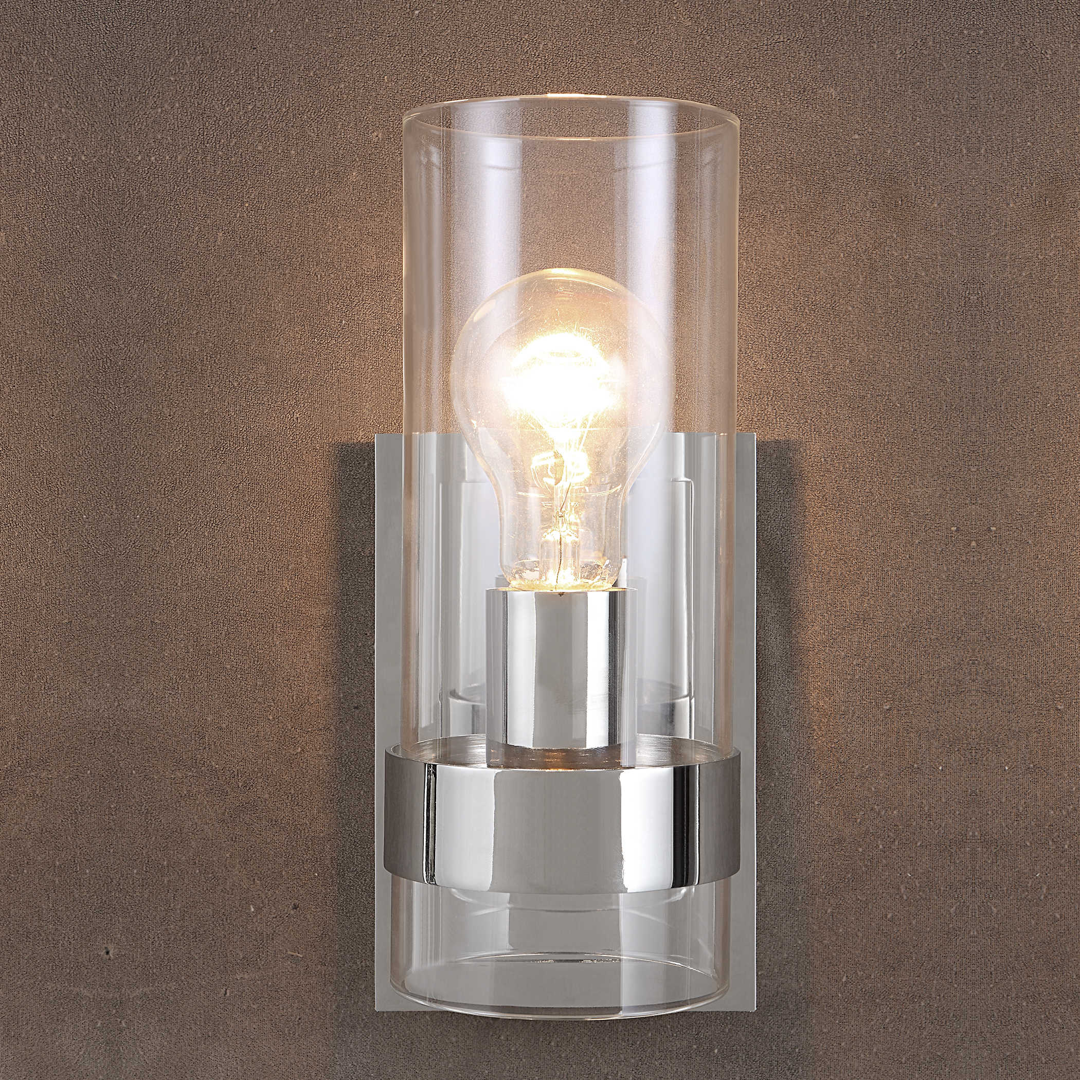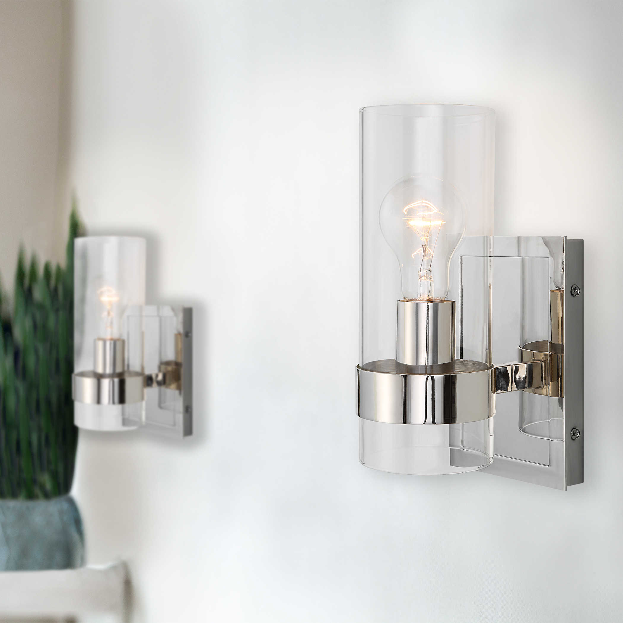 Clean Modern Lines Enhance This 1 Lt. Sconce Featuring A Wide Rings Holding The Clear Cylinder Glass Yielding A Floating Effect, Finished In Polished Nickel. 1-60 Watt Max, Edison Socket. Bulbs Not Included.