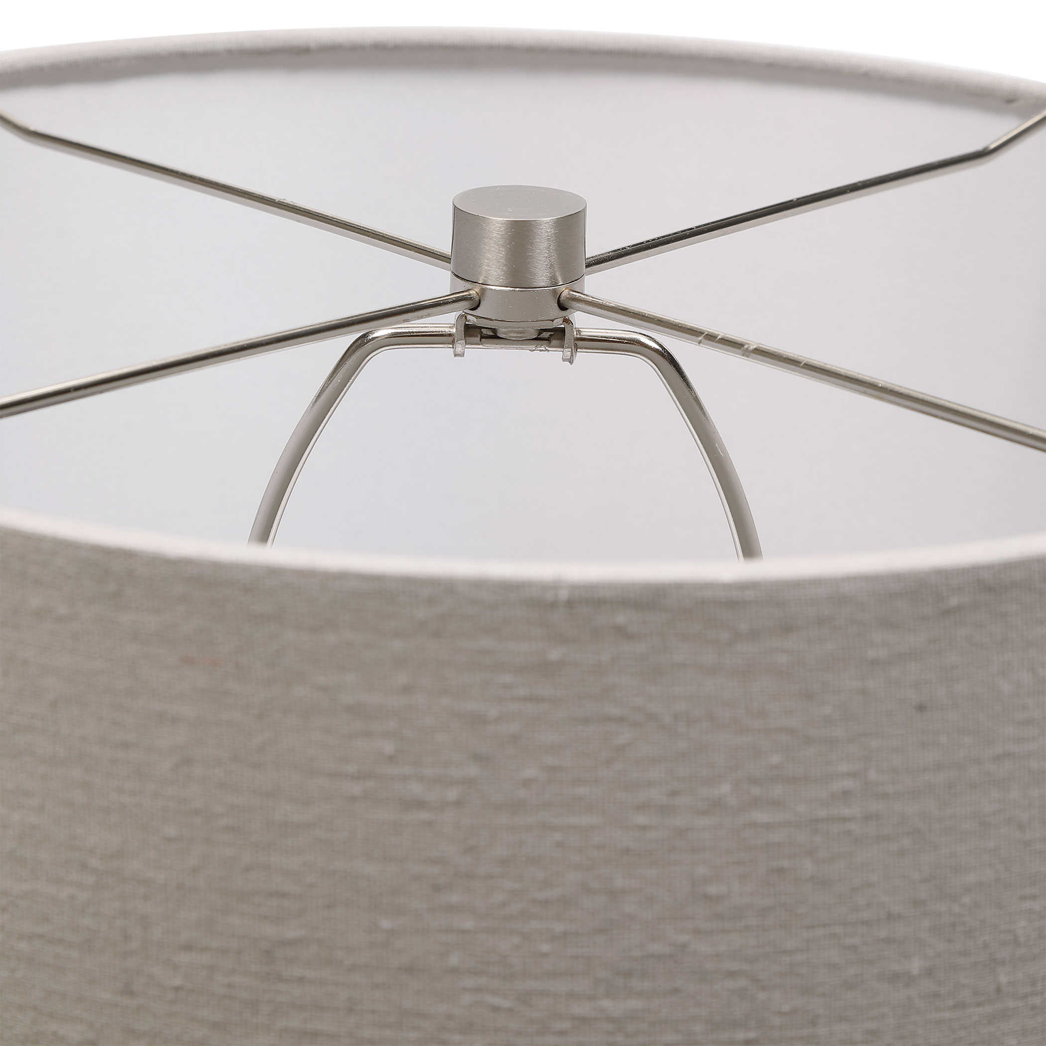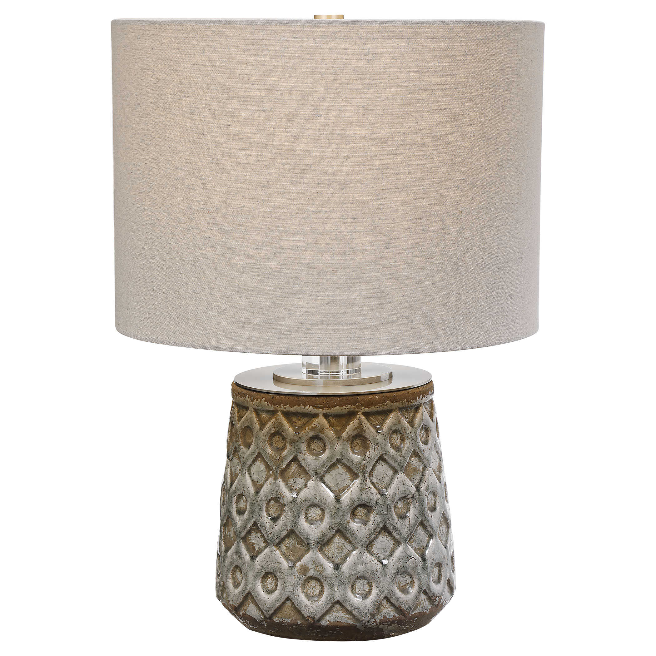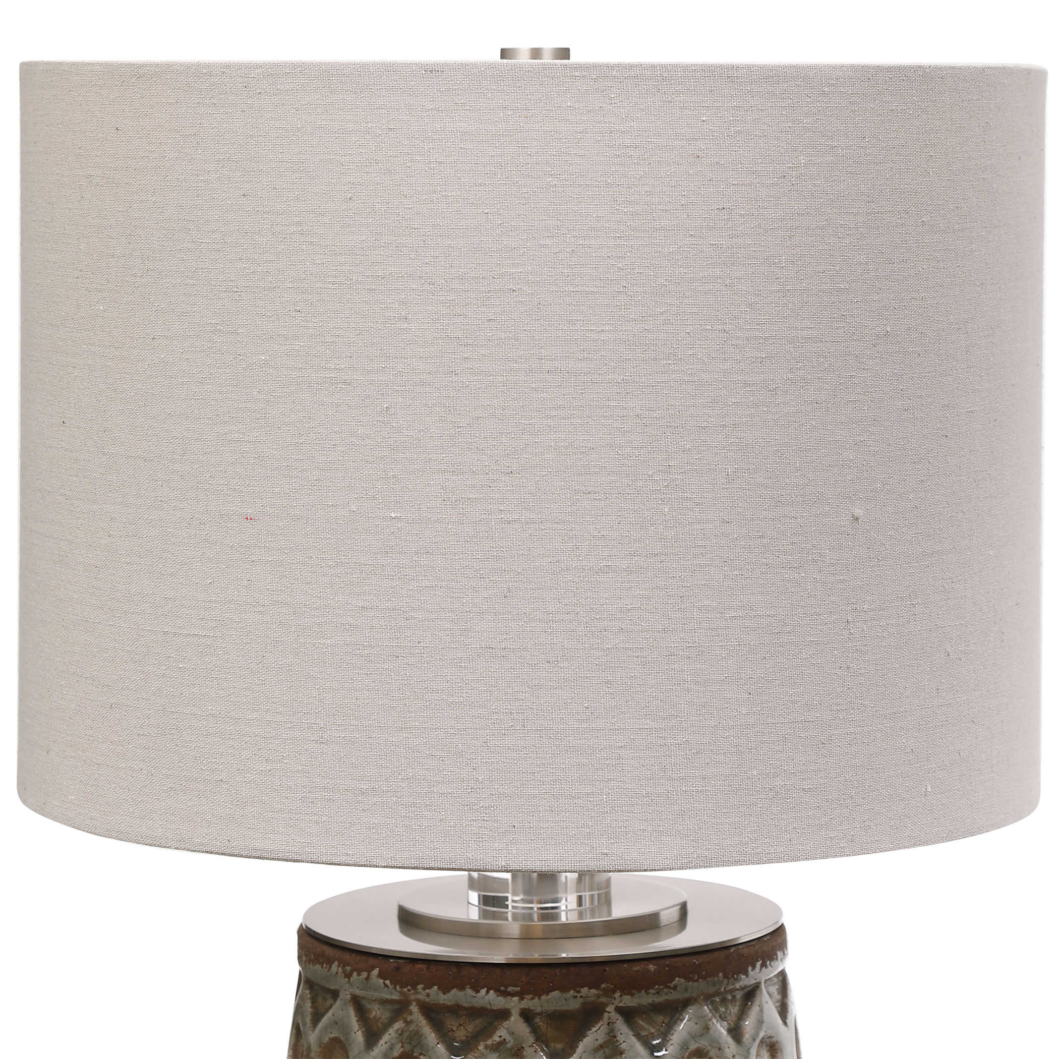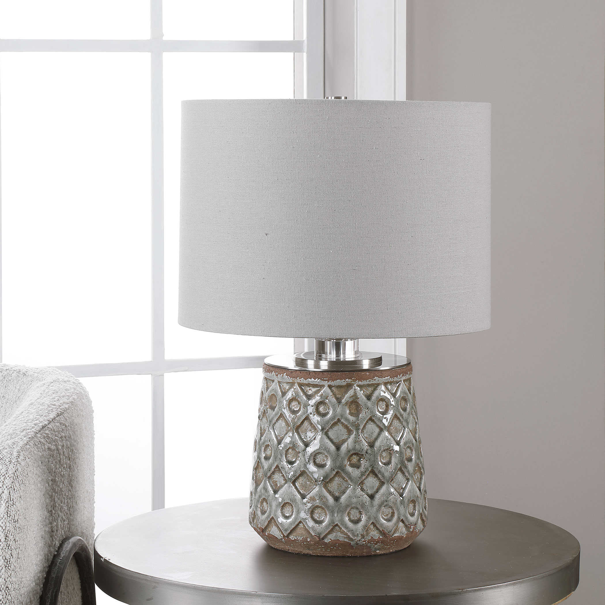 A Transitional Take On An Old-world Look, This Ceramic Table Lamp Features A Heavily Distressed Blue-gray Crackle Glaze With Intricate Embossed Geometric Details, Accented With Brushed Nickel Details And A Thick Crystal Collar. A Light Gray Linen Fabric Shade Completes The Look.