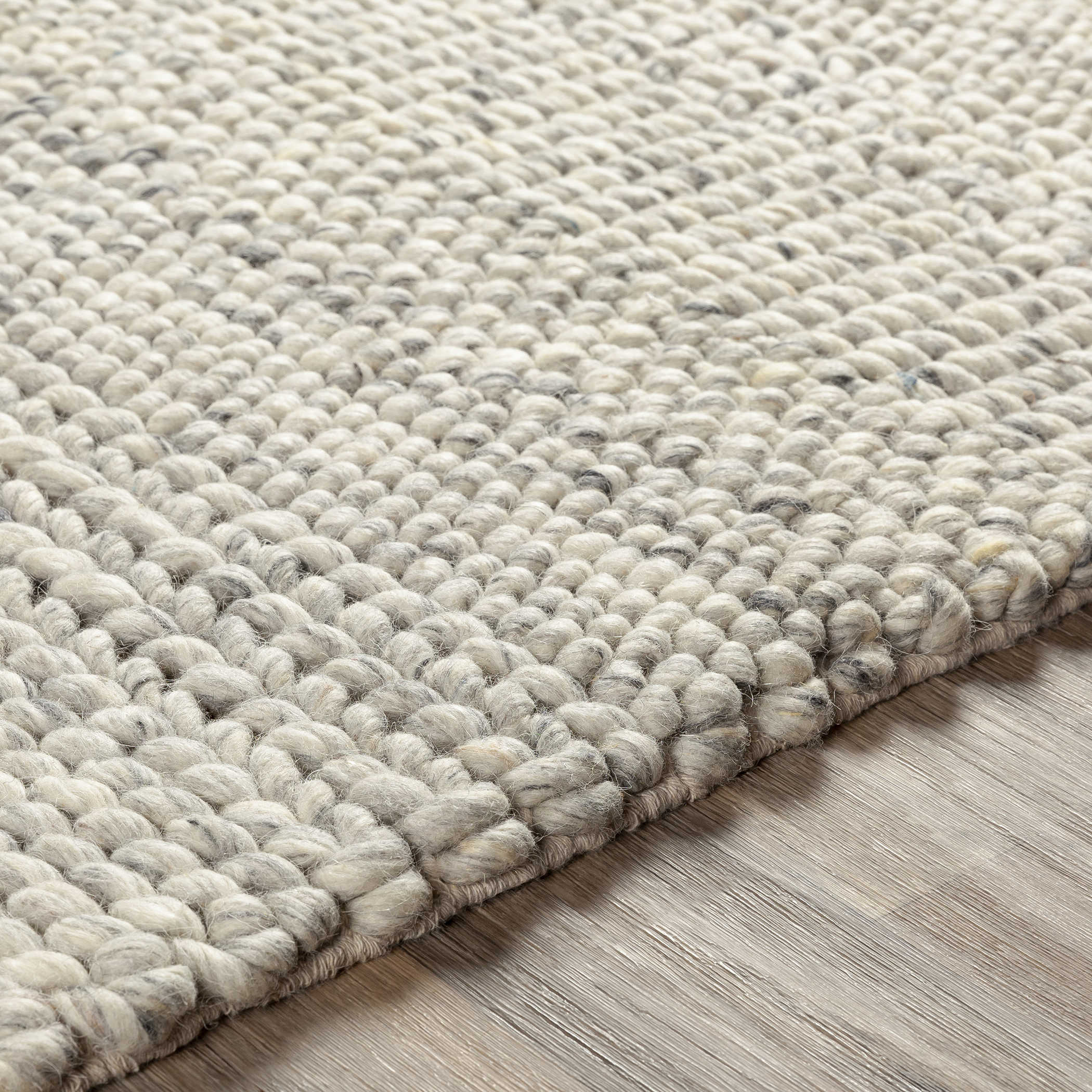 Hand Woven Ivory Wool With Subtle Light Gray Accents, Featuring Alternating Textures Of Large Loops, Knots, And Basket Weave Patterns.