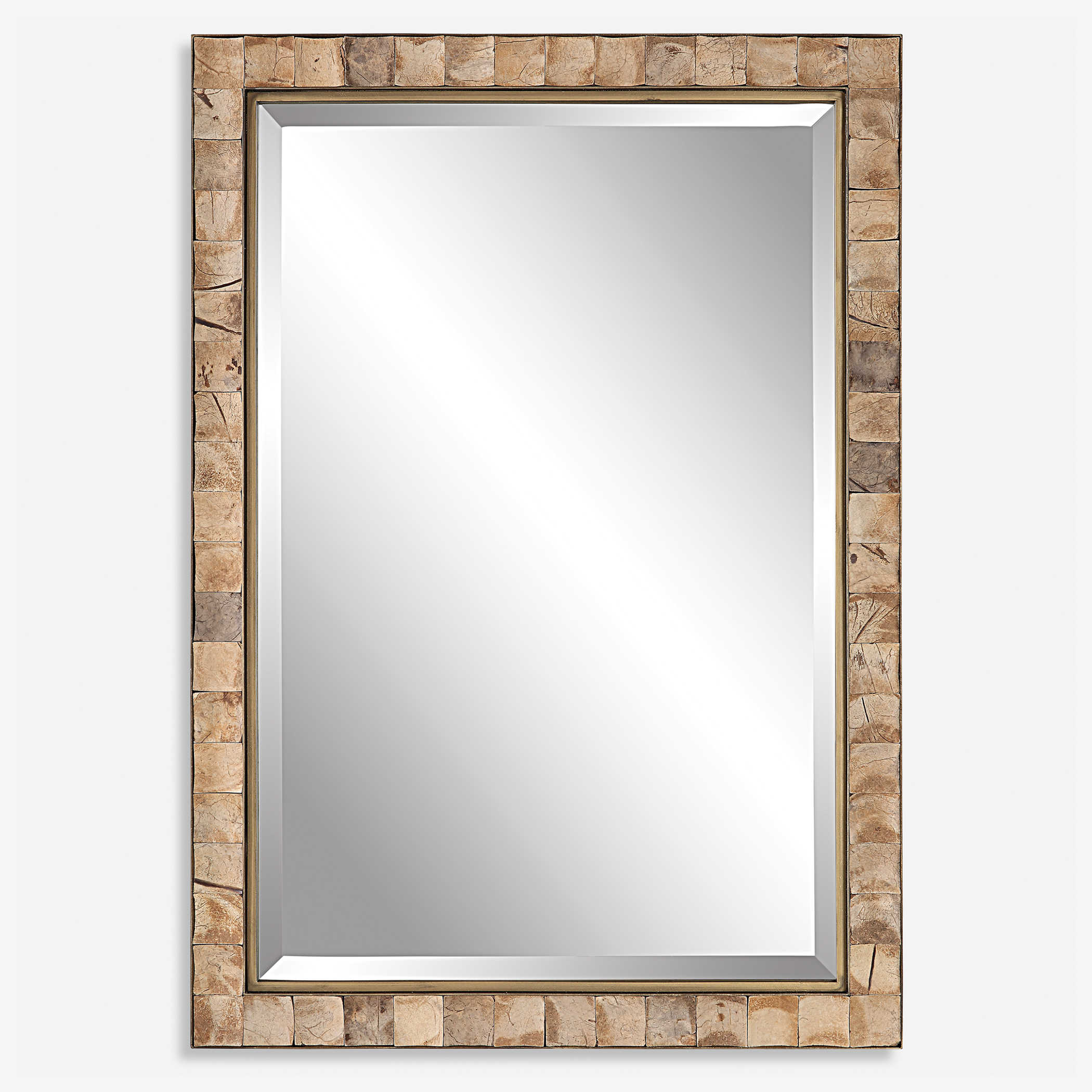 This Rectangular Mirror Showcases An Iron Strap Frame Finished In Dark Gold, Accented By Concaved, Polished Coconut Shells Inlays. Each Shell May Vary Slightly In Color, Adding To Its Authenticity And Character. The Mirror Features A Generous 1 1/4" Bevel And May Be Hung Horizontal Or Vertical.