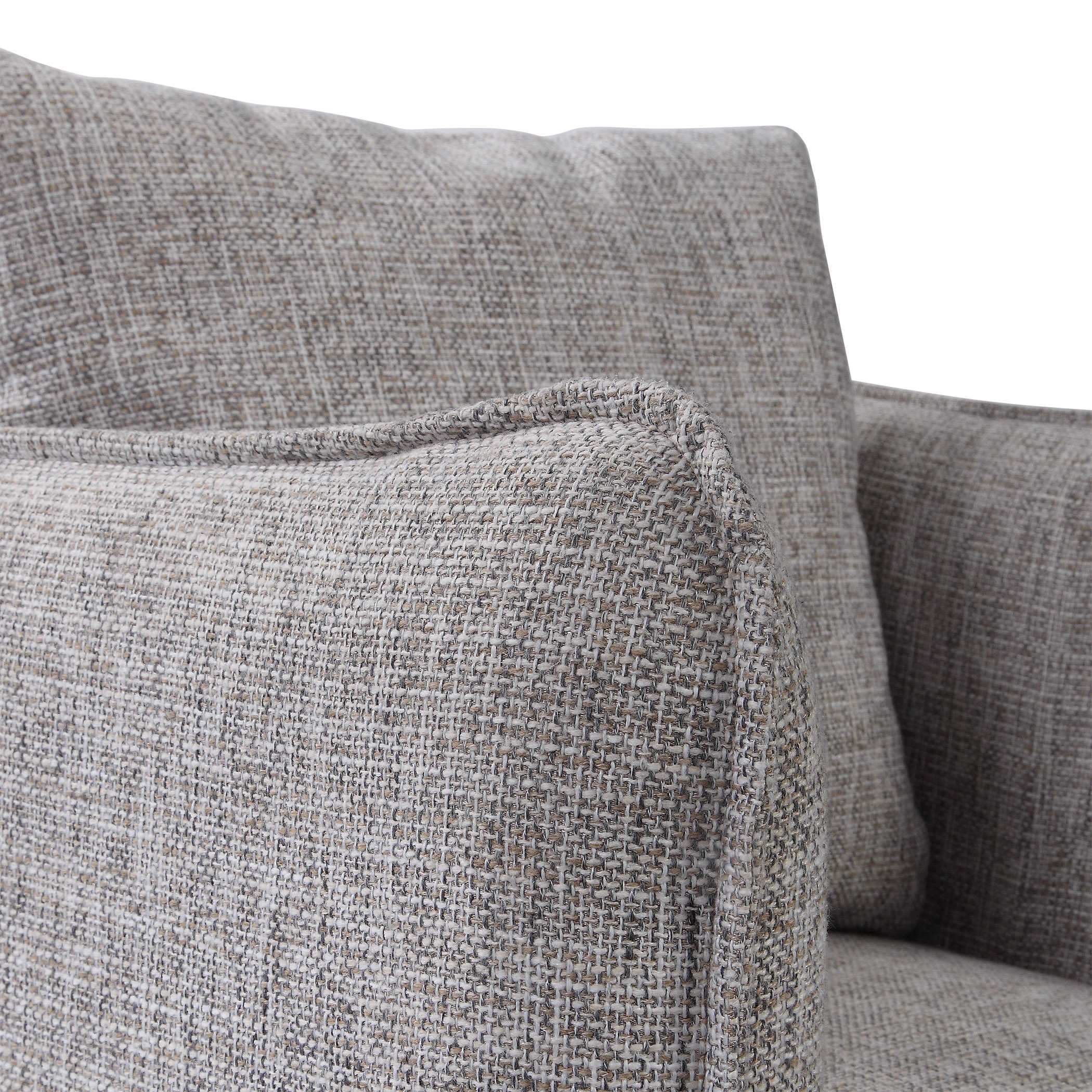 Casual Shelter Arm Accent Chair Tailored In A Woven Linen Blend Fabric In Natural Stone Hues Of Gray, Tan And Ivory. Features A Flanged Edge Trim Complete With A Loose Back Pillow. Rests On A Solid Birch Wood Swivel Base, Finished In A Weathered Gray Stain. Seat Height Is 19".