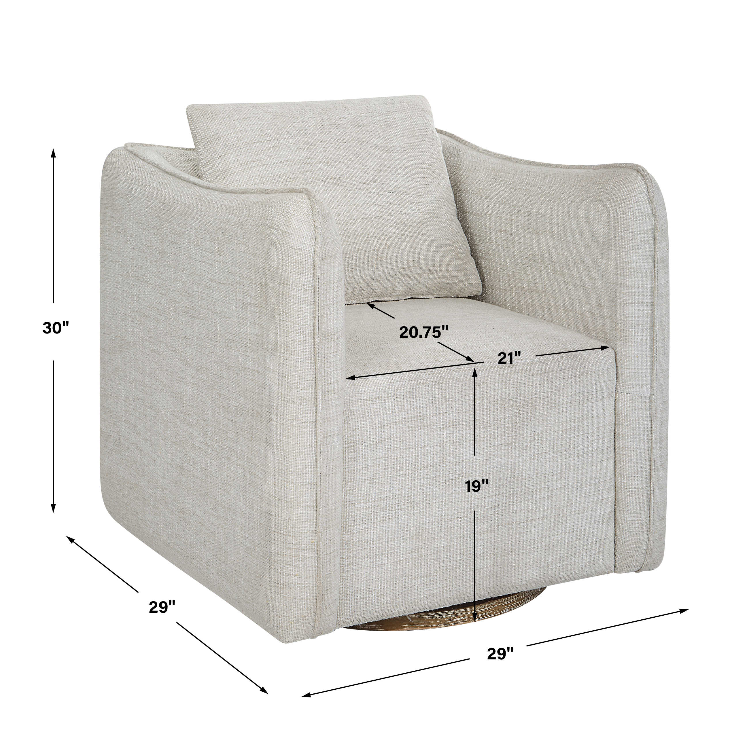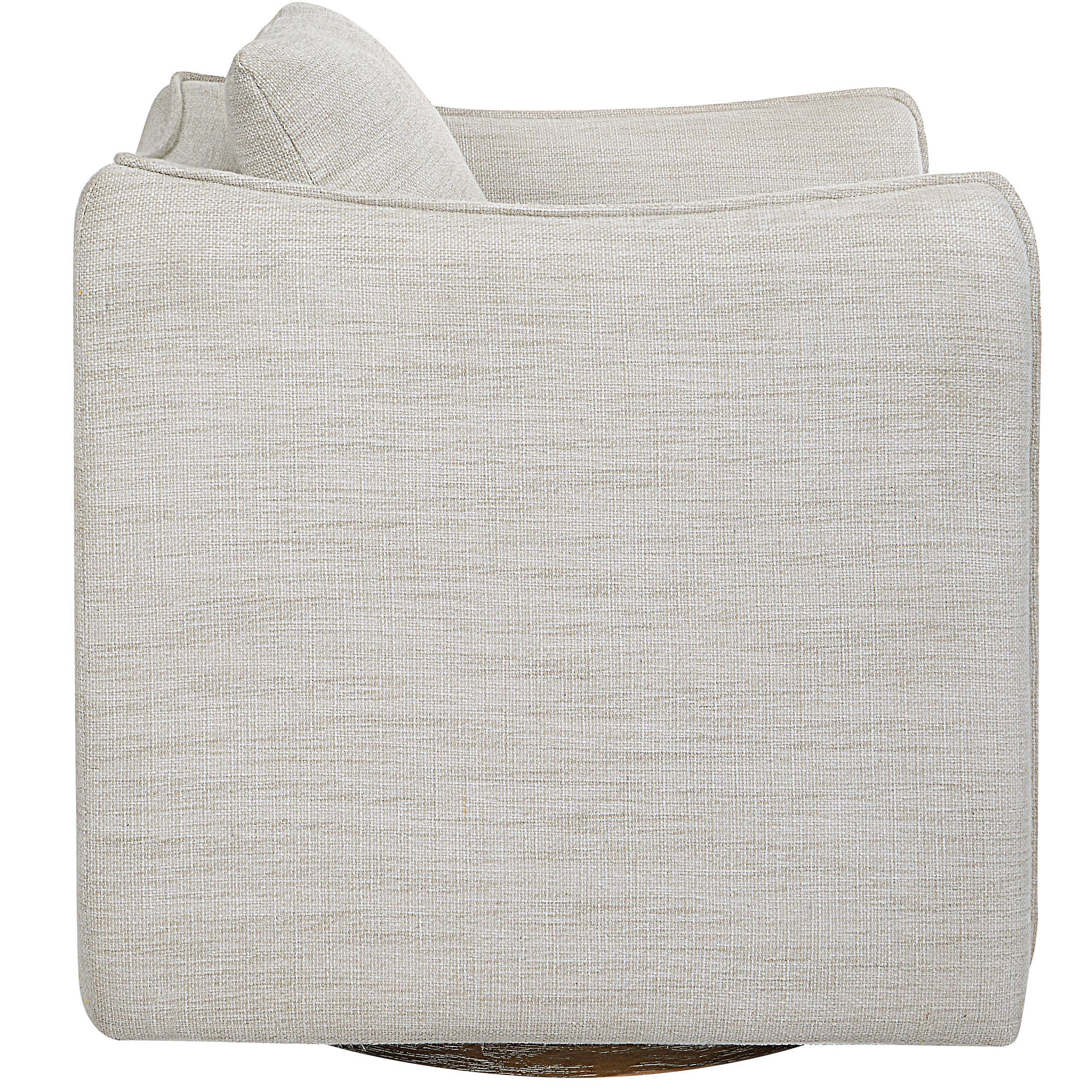 Casual Shelter Arm Accent Chair Tailored In A Woven Linen Blend Fabric In Off-white, Featuring A Flanged Edge Trim Complete With A Loose Back Pillow. Rests On A Solid Birch Wood Swivel Base, Finished In A Weathered Gray Stain. Seat Height Is 19"
