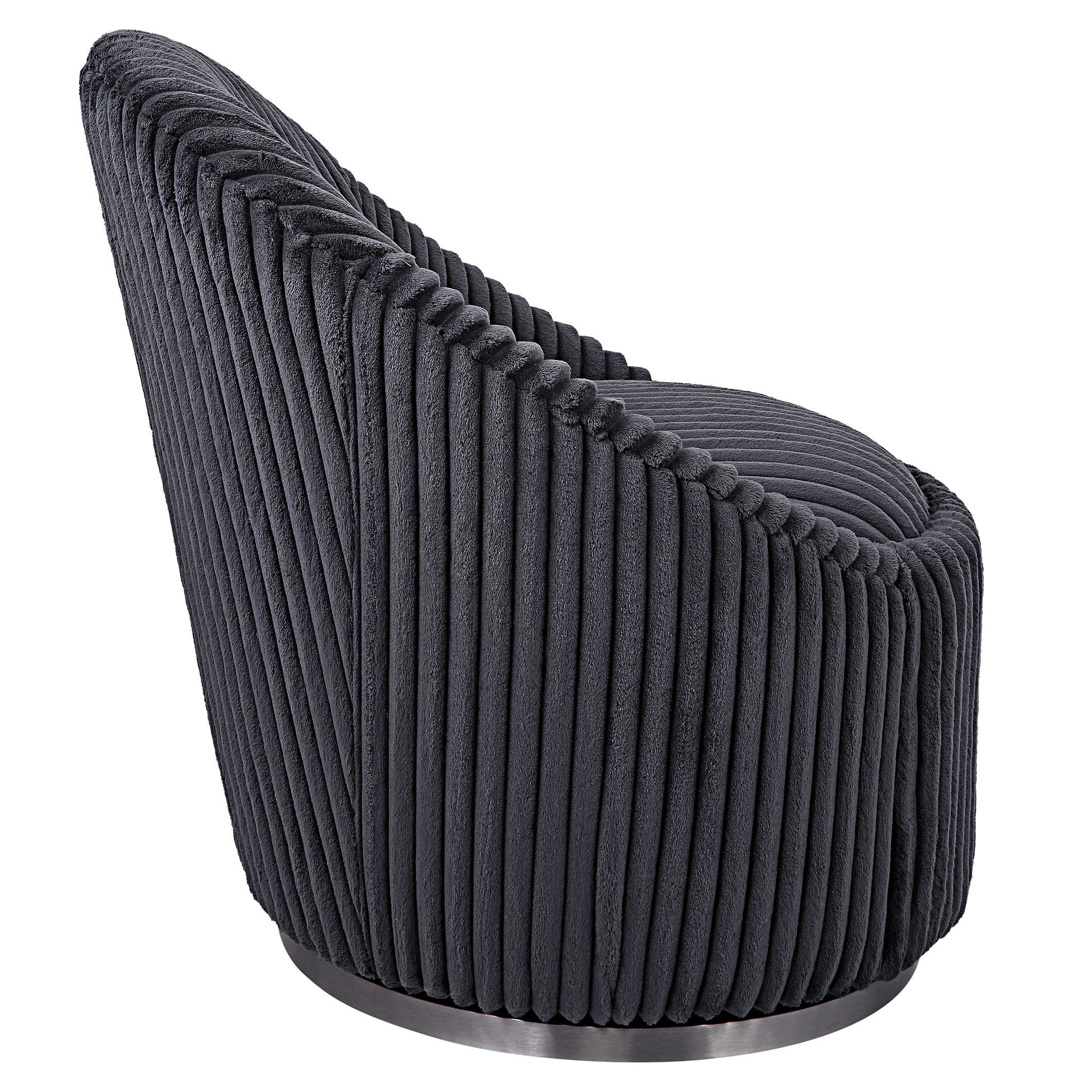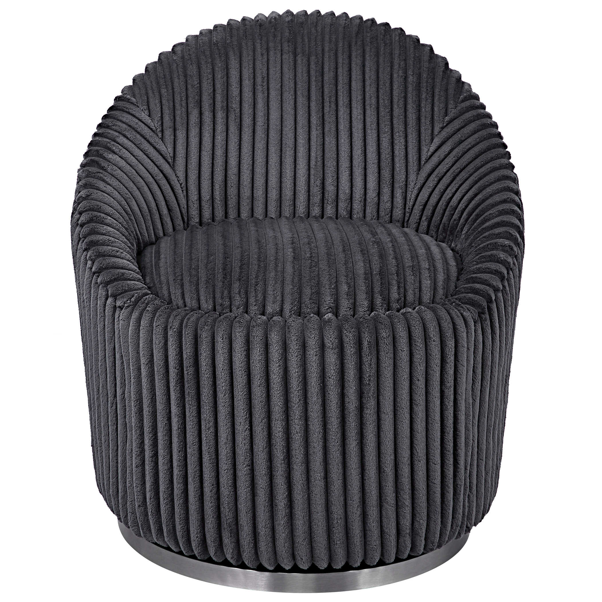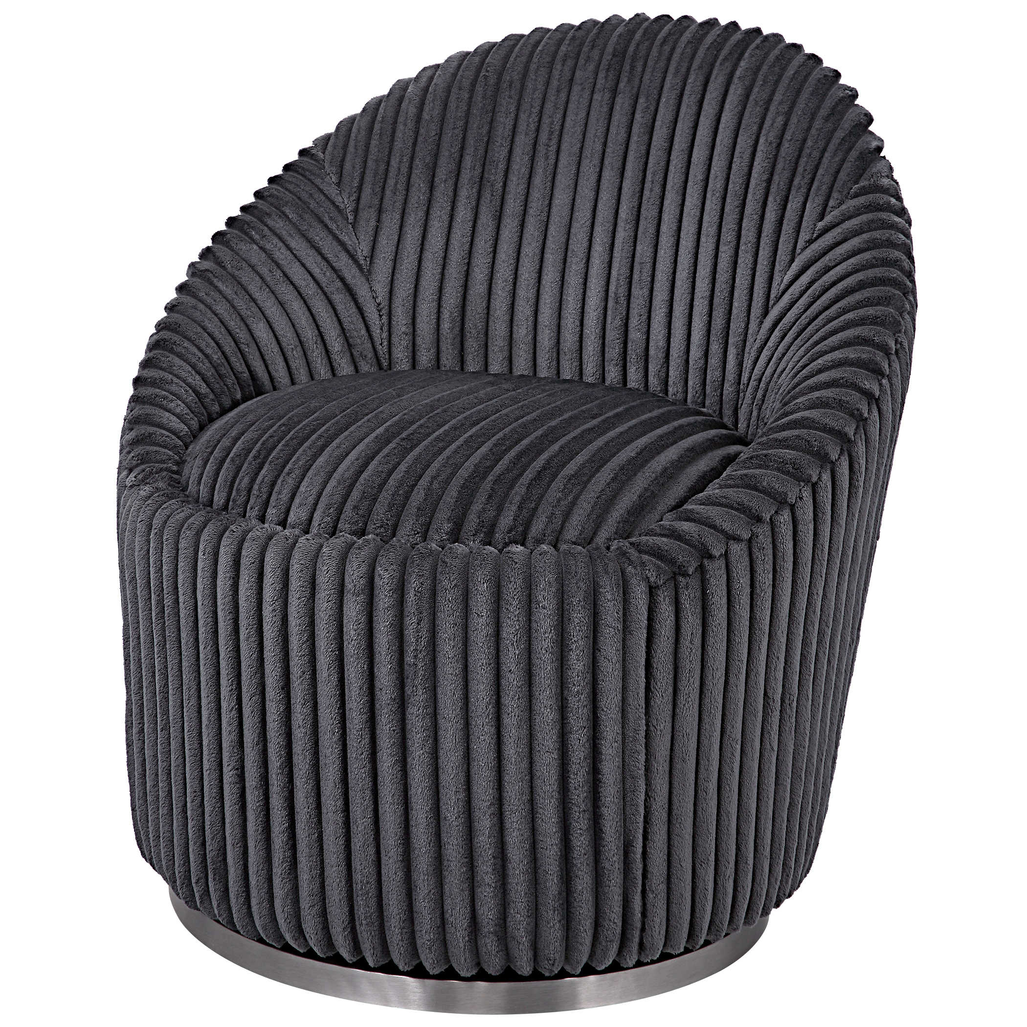 A Contemporary Accent With A Modern Edge, This Chair Is Upholstered In A Luxurious Fluted Gunmetal Chenille Fabric And Is Accented By A Stainless Steel Swivel Base Finished In Brushed Nickel. Seat Height Is 19".