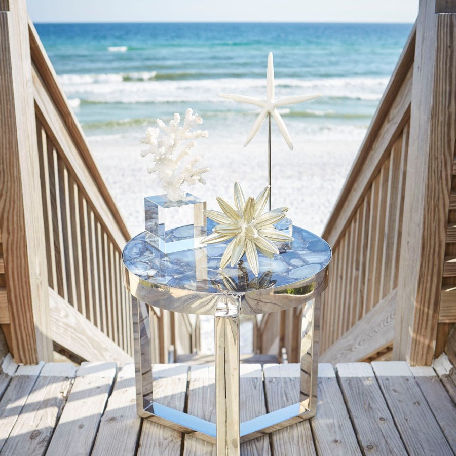Textured branches of coral reach in every direction from this charming coral sculpture. Perfect for an ocean enthusiast, these sculpture features a white finish and rests on a crystal cube base that glitters on a mantel or desktop.