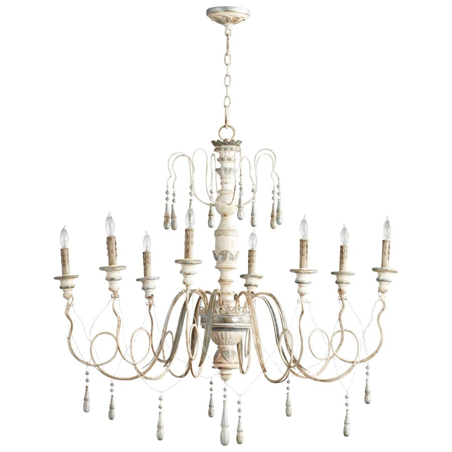 Transform your entryway or dining space with this stunning eight-light aged blue chandelier. Curlicue Parisian blue finish supports help give this fixture an air of romance. Beautiful beaded accents dangle from the chandeliers elegant framework. Eight 60 Watt Candelabra Base Lamp with 8' of Chain.