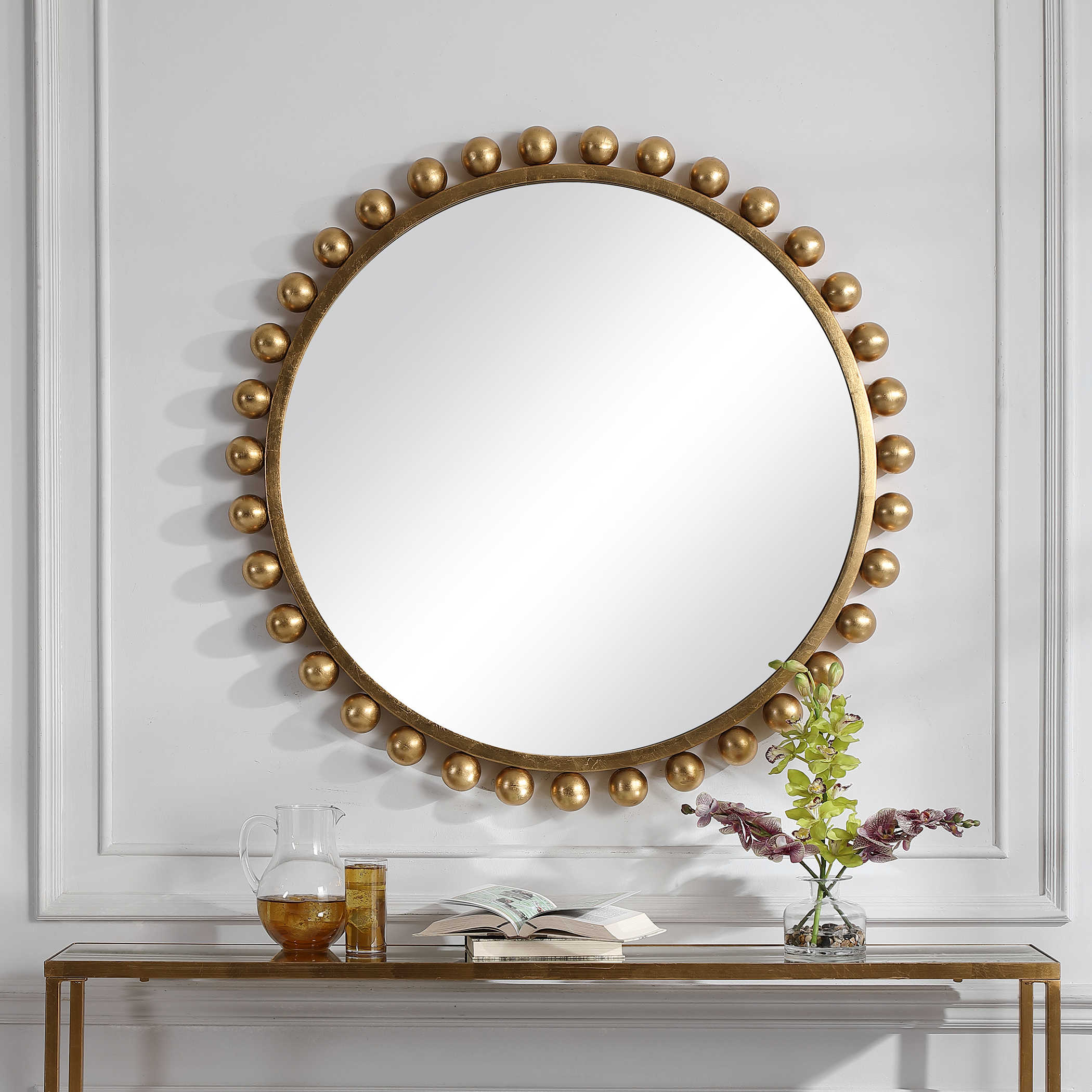 This Eye-catching Round Mirror Adds An Upscale Look And Sophisticated Style To Any Room By Showcasing Smooth Iron Spheres That Embellish A Sleek Inner Frame, Finished In A Clean Metallic Gold Leaf.