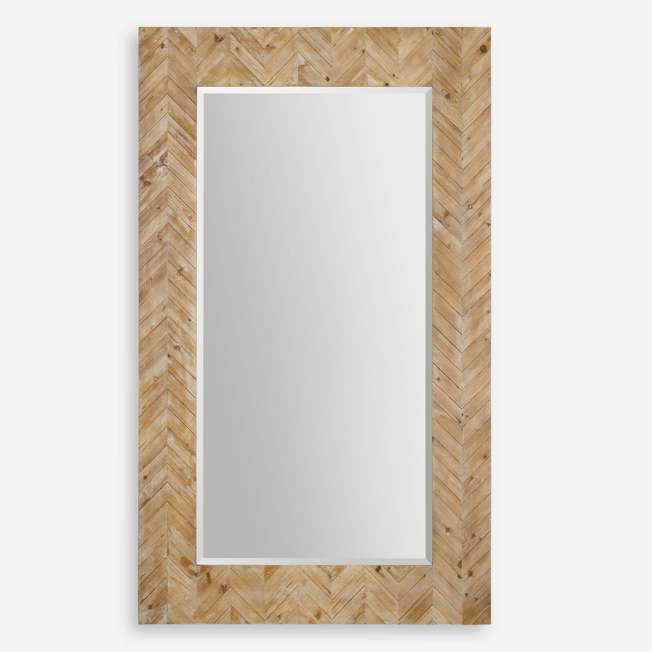 This Stately Mirror Features A Chevron Patterned, Solid Wood Frame Finished With A Light Gray Glaze. Mirror Has A Generous 1 1/4" Bevel And May Be Hung Horizontal Or Vertical.