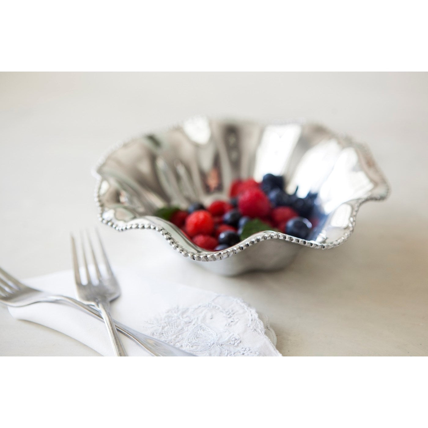 A dainty pattern of beads follows the undulating rim of the small Denisse bowl, creating a shimmering, cascading look that will delight the senses. A unique gift that is ideal for serving dips and sauces, nuts and other snacks. Made of a top quality, FDA safe, easy-care, oven and freezer friendly aluminum alloy.