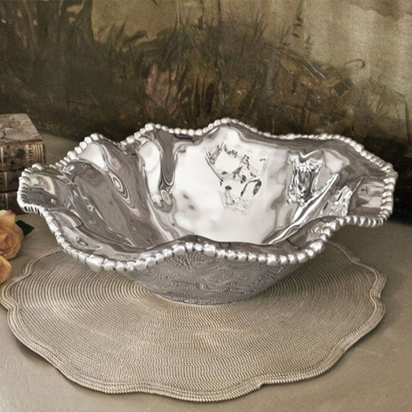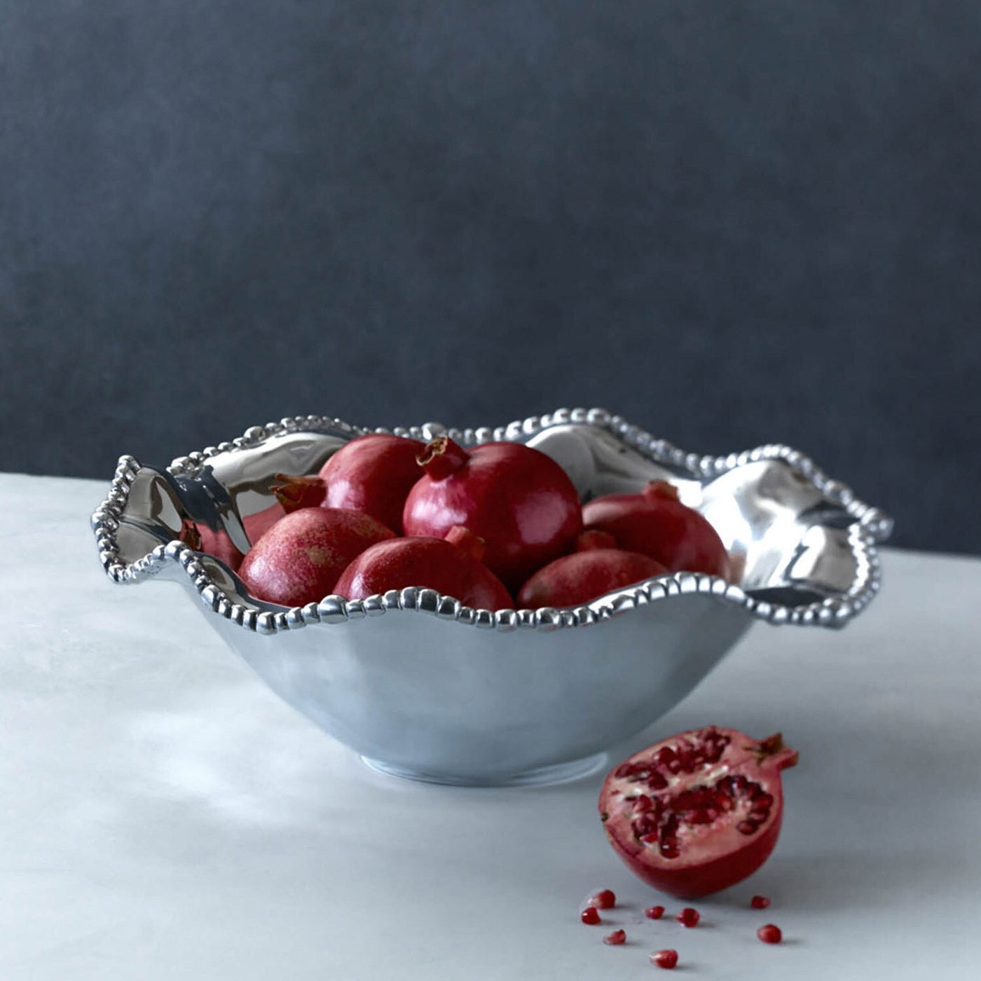 Graceful curves, rippling pearls, and a gleaming finish distinguish this lovely bowl. The Diana large decorative metal bowl can be used for salads, and snacks, or as a centerpiece. Made of an FDA safe, easy-care, oven and freezer friendly aluminum alloy.