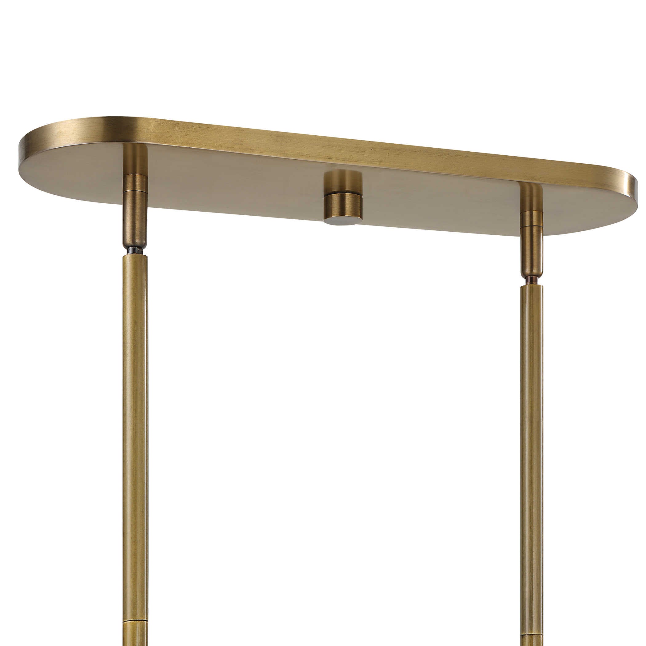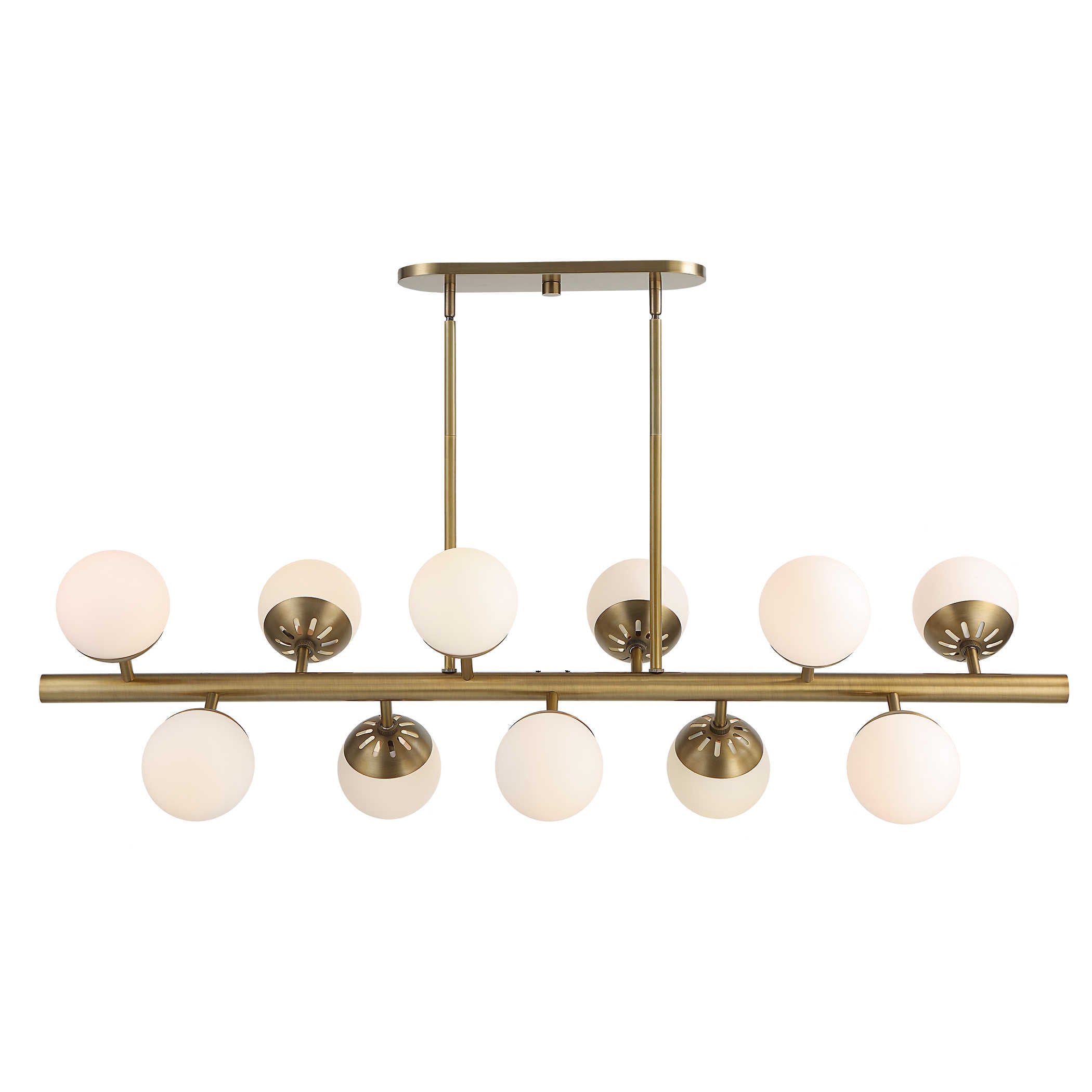 Designed With Mid-Century Roots But Featuring A Linear Center Structure Finished In A Warm Antique Brass And Accented With 5" Matte White Opal Globes Yields A Modern Take On Vintage Inspiration. 11-60 Watt Max G16.5 Candelabra Sockets. Bulbs Not Included. Supplied With 20' Wire, 6-12" Stems And 2-6" Stem For Adjustable Installation.