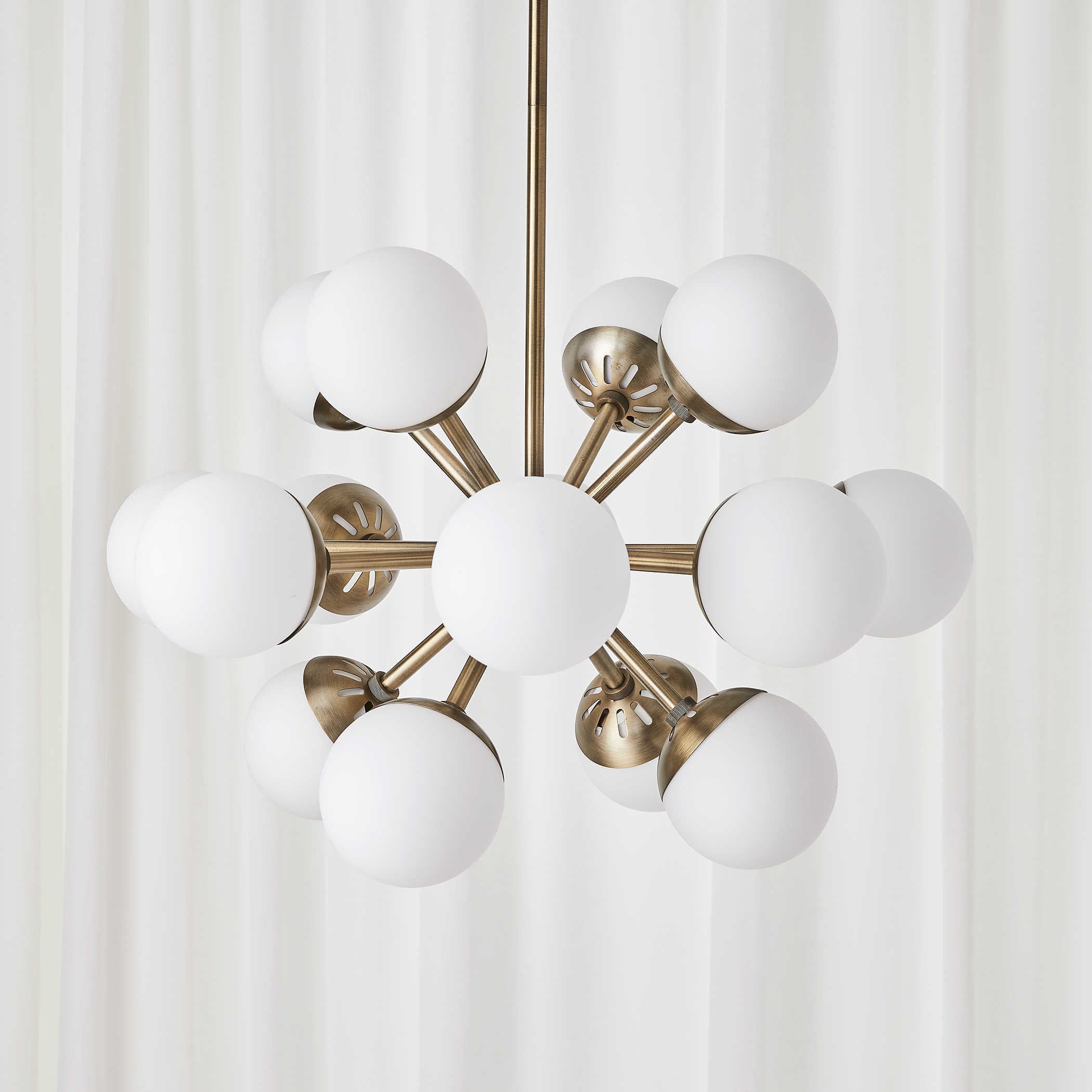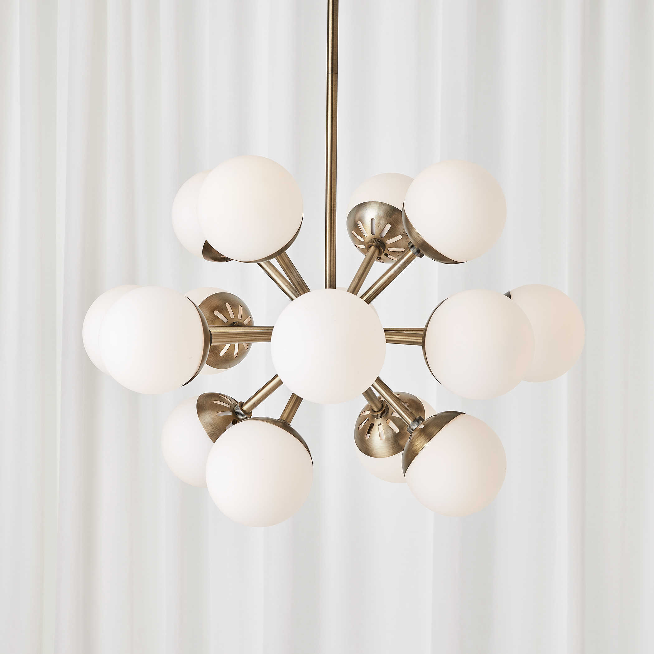 Designed With Mid-Century Roots A Sputnik Center Structure Finished In A Warm Antique Brass And Accented With 5" Matte White Opal Globes Yields A Modern Take On Vintage Style. 16-60 Watt Max G16.5 Candelabra Sockets. Bulbs Not Included. Supplied With 15' Wire, 3-12" Stems And 1-6" Stem For Adjustable Installation.