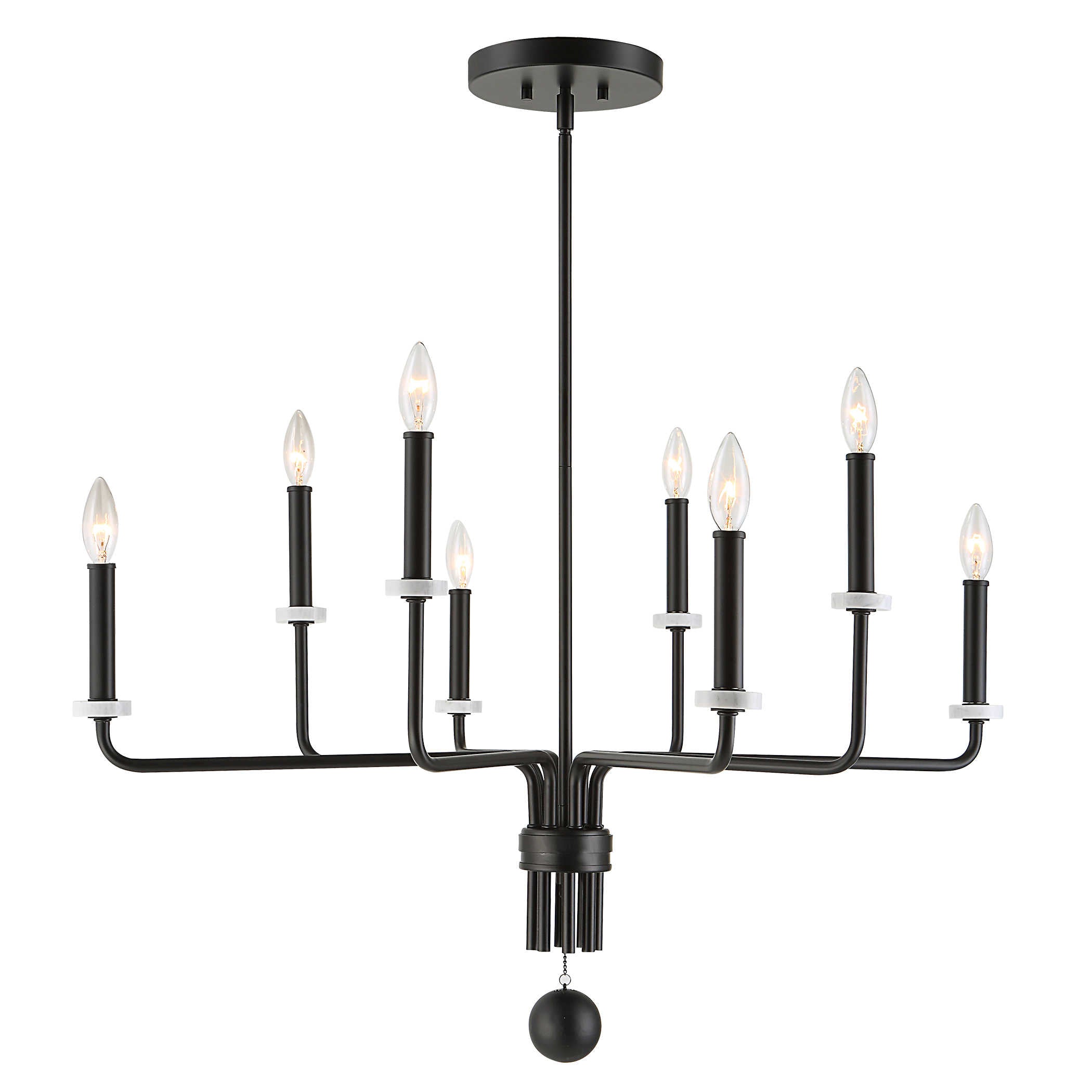 Modern & Sleek Softly Bent Lines Give This 8 Lt. Chandelier A Dramatic Feel, Finished In A Deep Matte Black With Chic White Marble Disc Bobeches. 8-60 Watt Max, Candelabra Sockets. Bulbs Not Included. Supplied With 15' Wire, And 3-12" Stems & 1-6" Stem For Adjustable Installation.