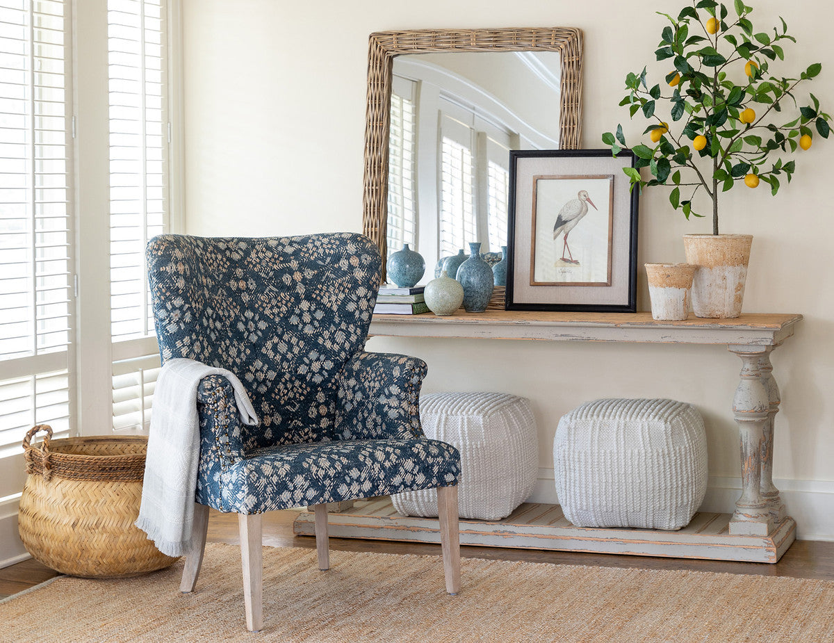 With its graceful lines, our Estella upholstered arm chair is covered in a modern floral, textural pattern fabric in shades of blues with tan accents. Nail head trim and light wood legs complete the look. Perfect for an afternoon read with your favorite book. Finish may vary