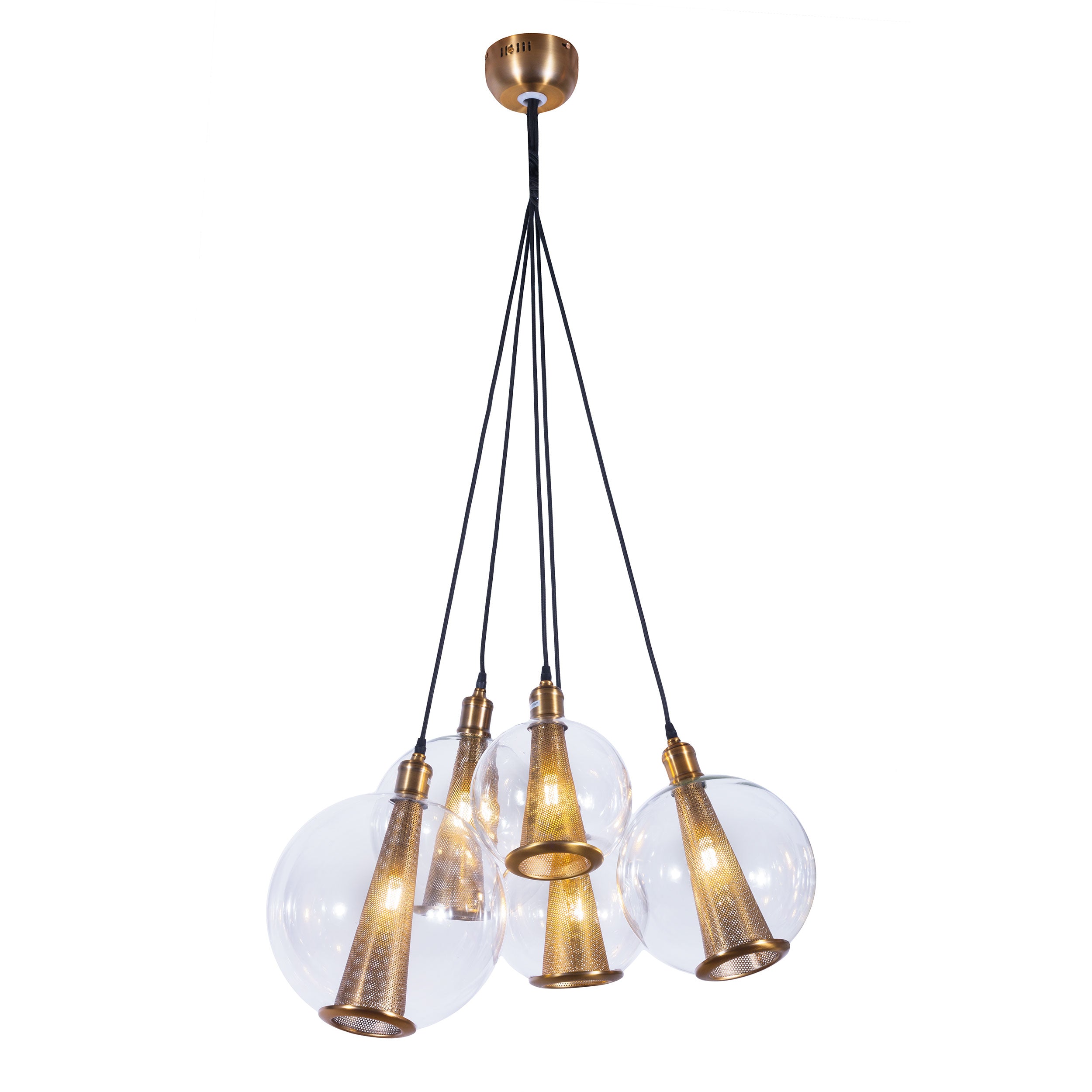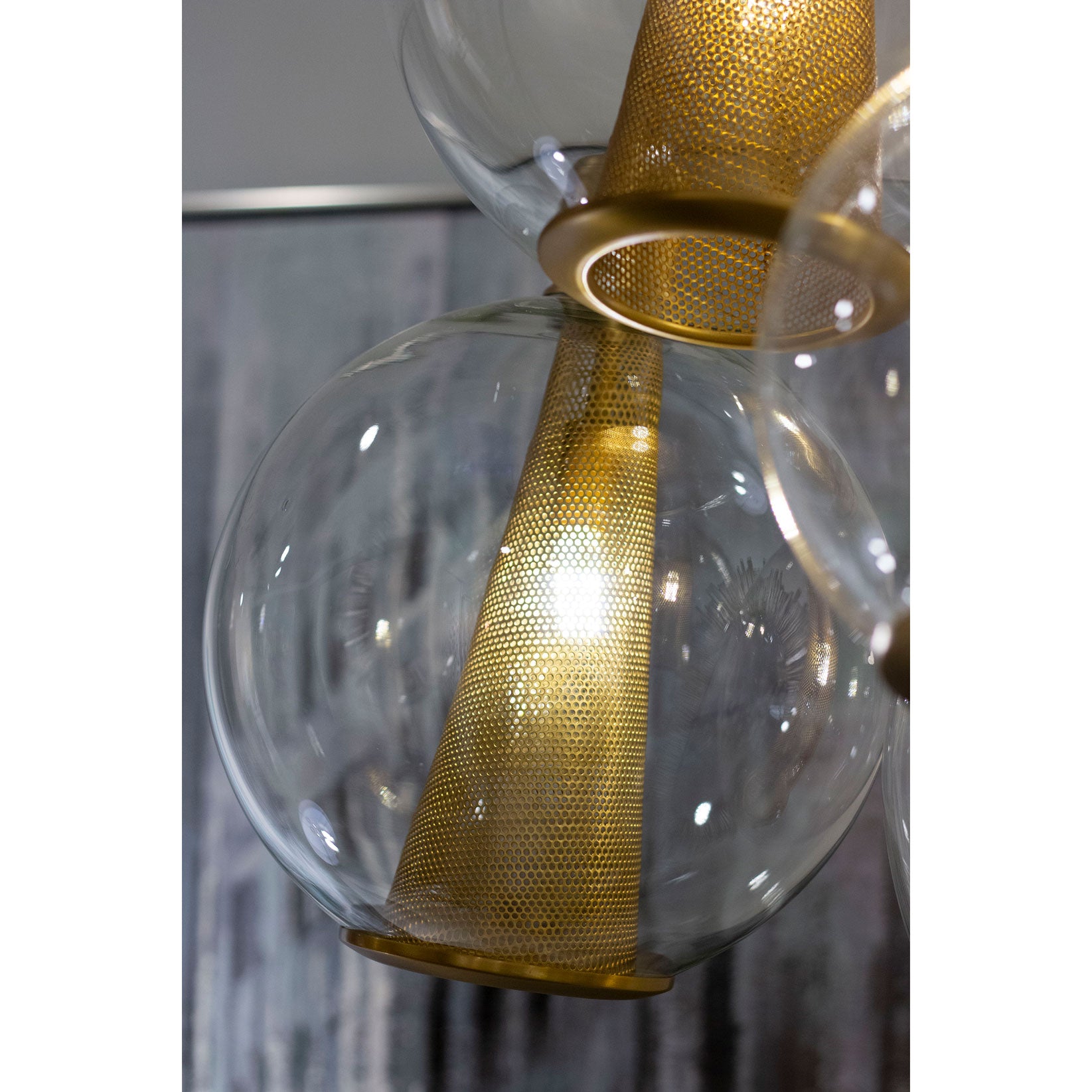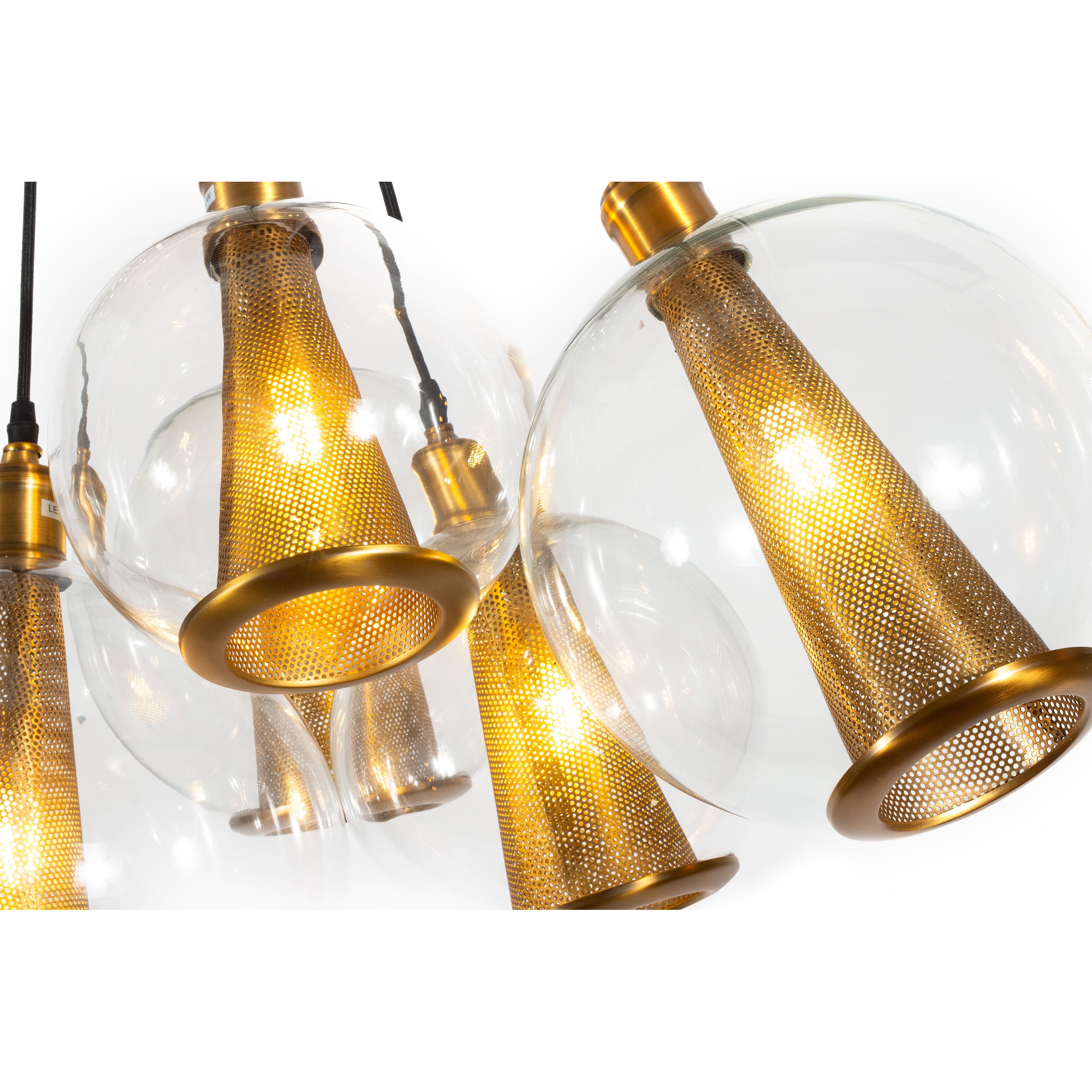 Pulling inspiration from midcentury and art deco themes this chandelier features five fluted pendants of warm gold, surrounded by glass globes. Each globe can be hung to a different height to add variety and texture to any space.