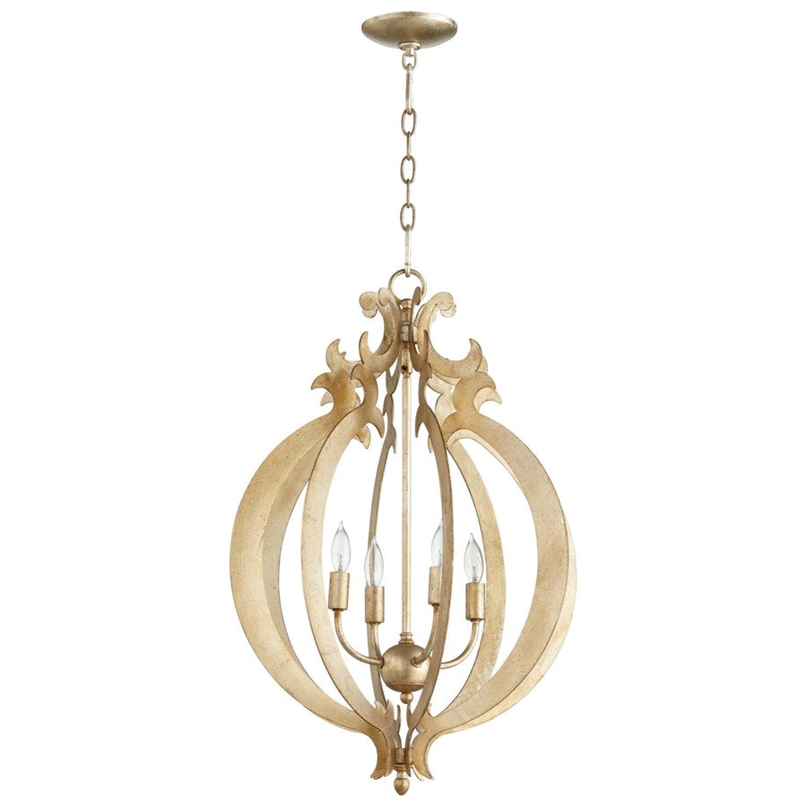 Celebrate a design motif from decades past. This elegant four-light aged silver leaf iron pendant brings a romantic look and a fresh use of color. A ribbed cage with simple curls affects a handsome, understated profile.