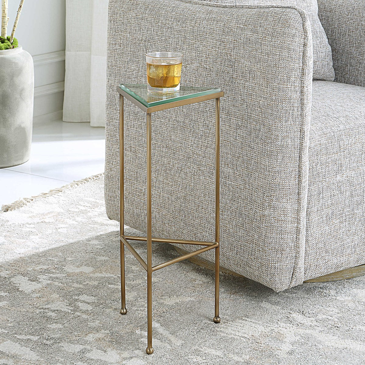 This Quirky Triangular Drink Table Features A Sturdy Iron Frame, Finished In A Sophisticated Brushed Gold With A Thick Glass Top. Perfect For Displaying A Cocktail Or Your Favorite Book.