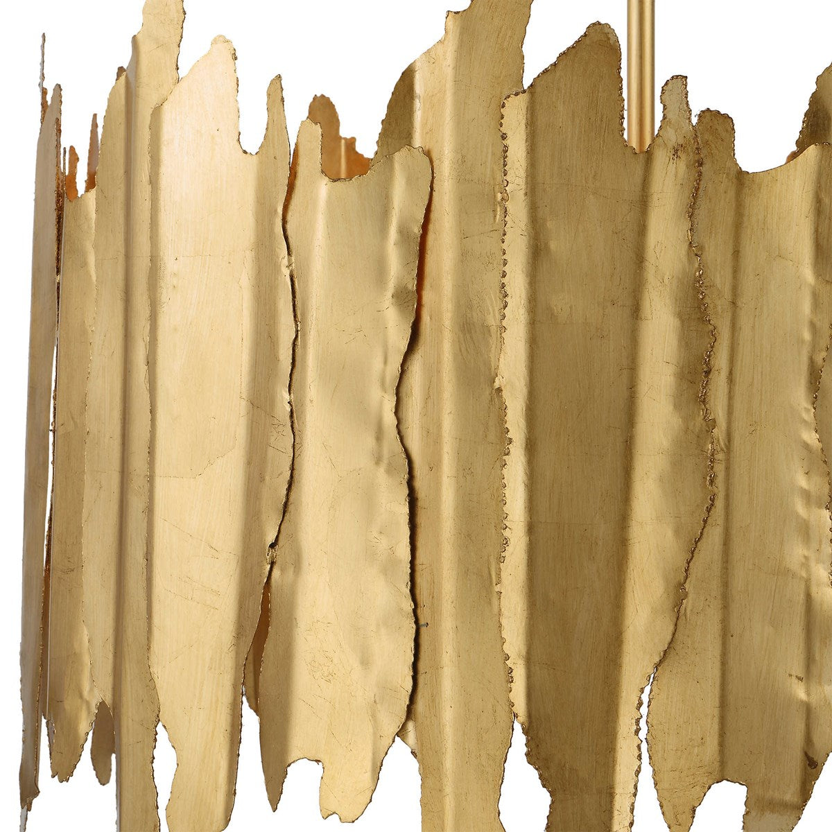 Industrial Metal Segment Sheets Welded With Rough Cut Edges Juxtaposed With A Gold Leaf Finish Give An Elegant Look To This Chic Pendant. 8-60 Watt Max Candelabra Sockets. Bulbs Not Included. Supplied With 15' Wire, 3-12" Stems And 1-6" Stem For Adjustable Installation.