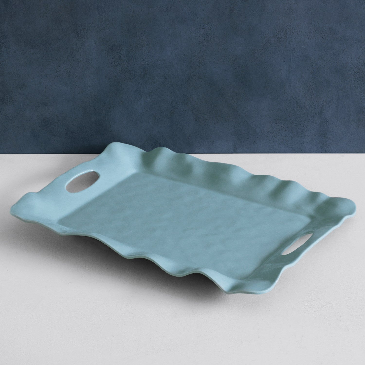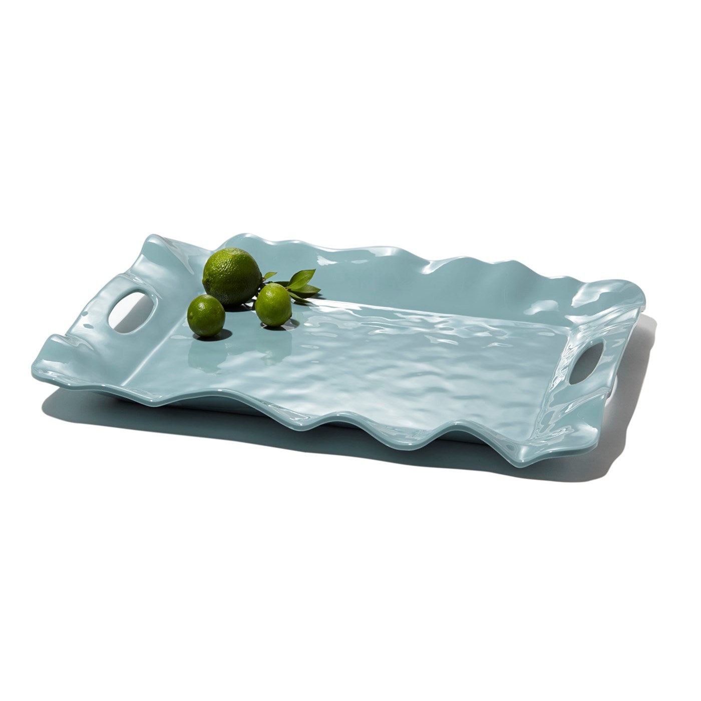 A tray for all seasons. With a generous serving area and practical notched handles, this Aqua Rectangular Tray an essential element in our new Havana Collection, a luxury melamine line designed with distinctive Beatriz Ball flair. Having the substance, weight, and appearance of ceramics, this aqua melamine tray is as beautiful as it is practical. Dishwasher safe (top rack), heavy-weight, break resistant and durable, food safe, BPA and PABA free.