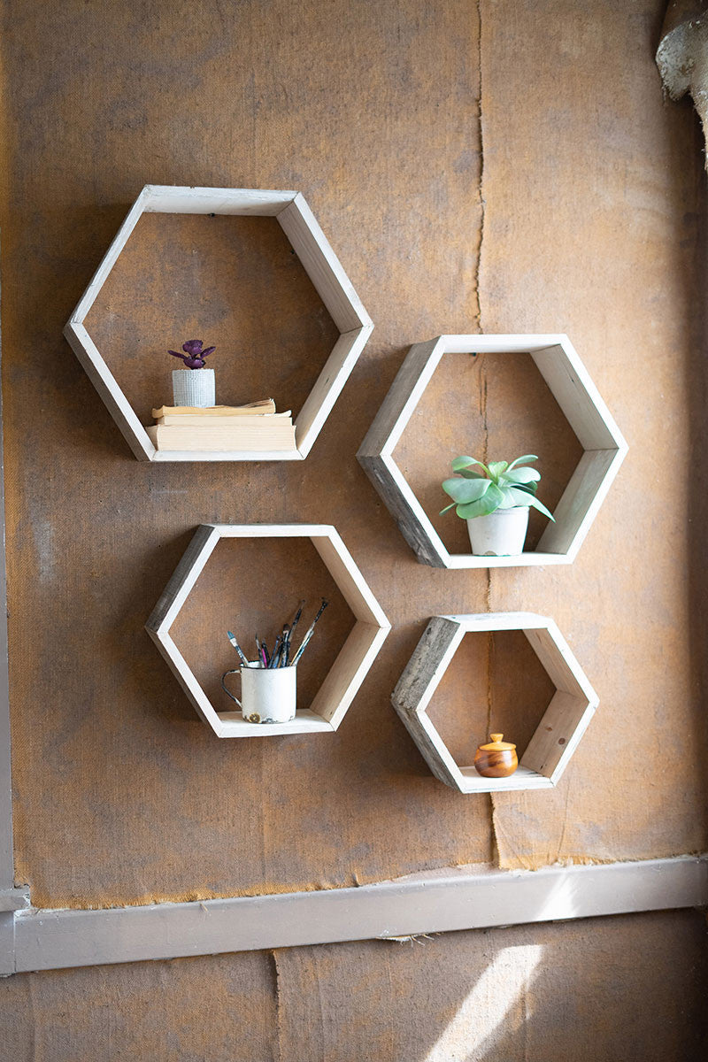 Recycled white-washed wood hexagon wall shelves, set of 4.