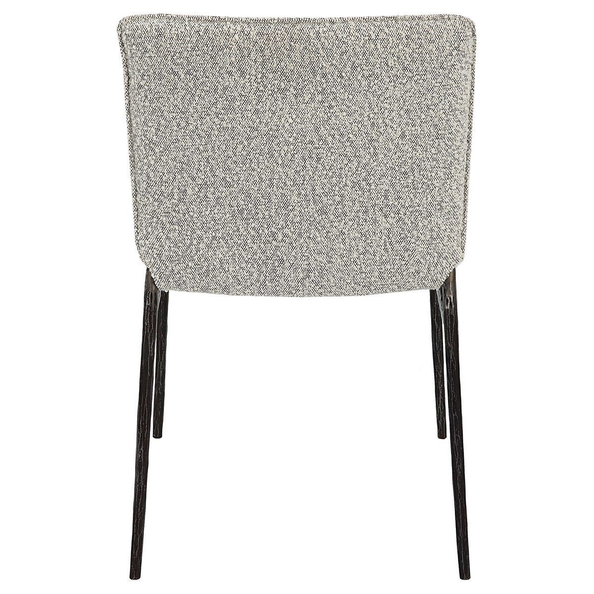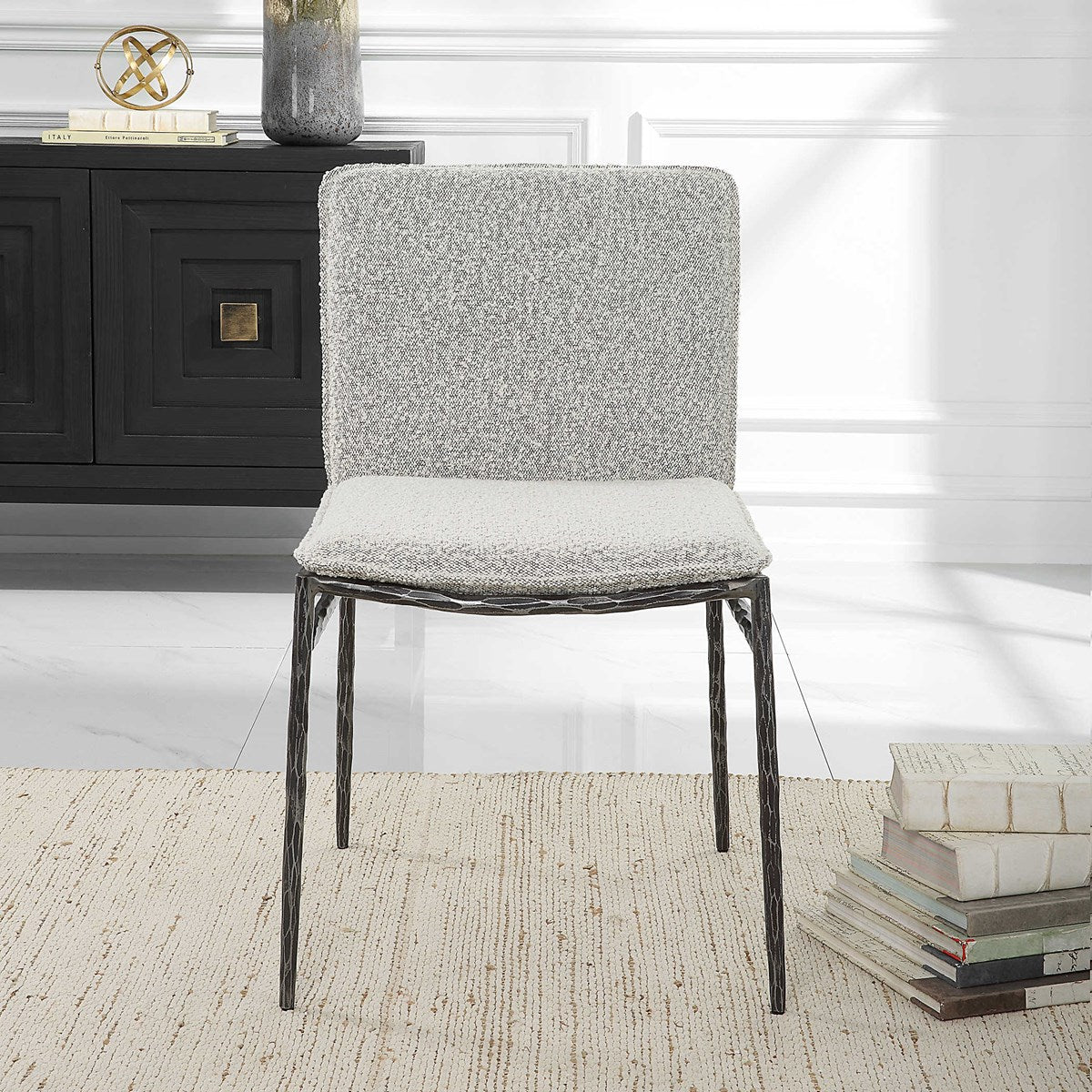 Inspired By Contemporary Designs, The Jacobsen Dining Chair Showcases Curved Lines With A Chiseled Iron Frame In A Natural Aged Black Iron Finish. A Casual Ivory And Warm Gray Boucle Fabric Accents This Modern Look. Seat Height Is 19".
