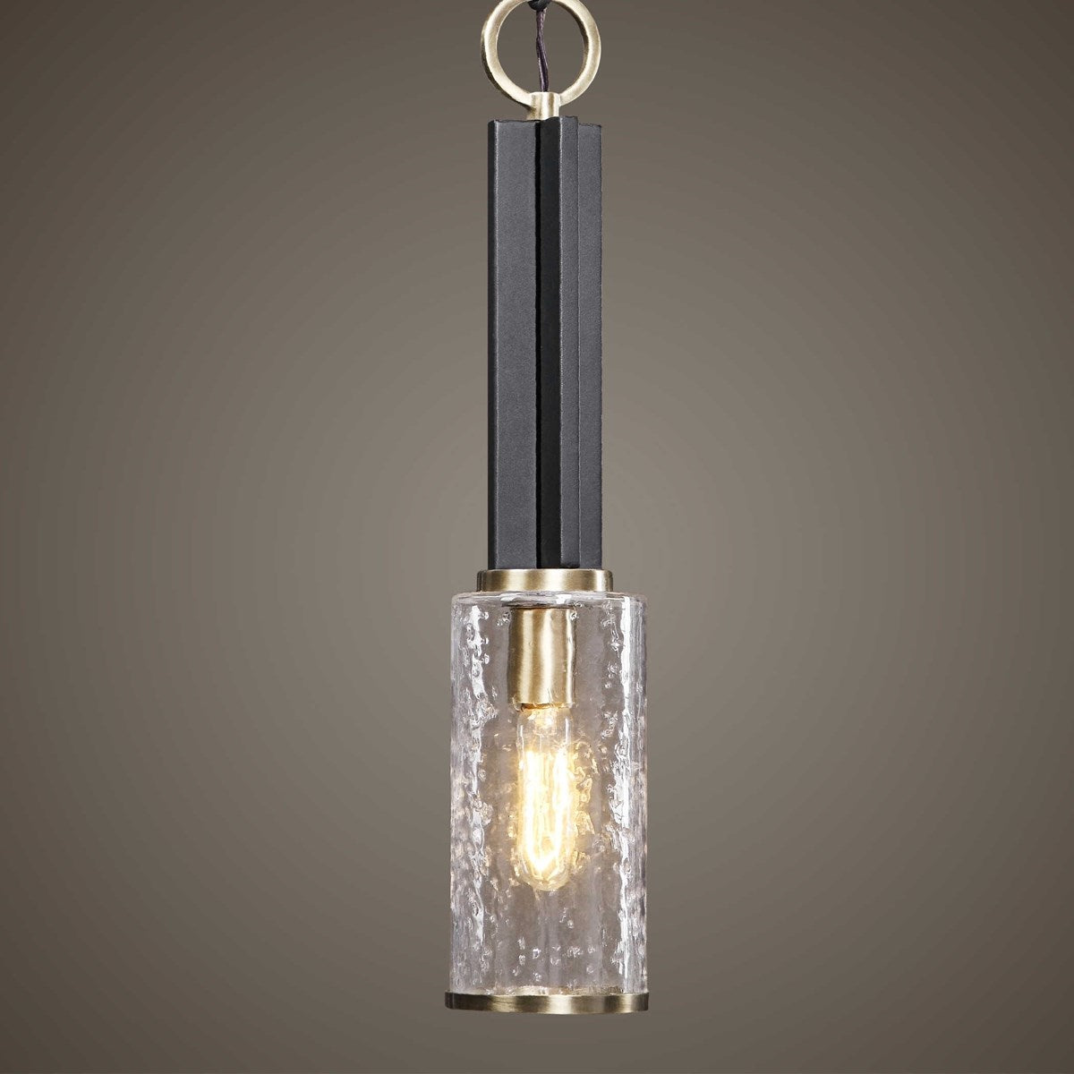 Refined Industrial With Clean Lines On Our 1 Lt. Mini Pendant Features A Sanded Black Finish On The I-beam Style Frame With Refined Antique Brass Accents And Clear Meteor Shower Glass Shade. 1-60 Watt Max, Edison Socket. Bulbs Not Included. Supplied With 12' Wire And 5' Chain For Adjustable Installation.