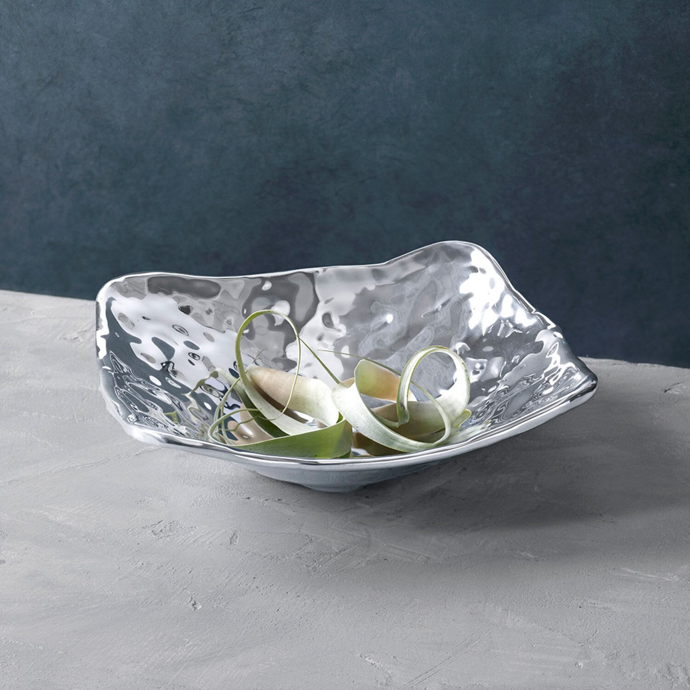 The Jena medium decorative silver bowl features sloping, textured sides that open up to reveal the beauty of the food inside. Perfect size for hummus or guacamole. Made of a top quality, FDA safe, easy-care, oven and freezer friendly aluminum alloy.