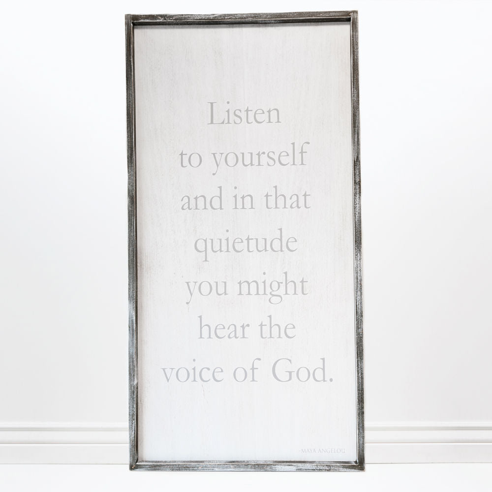 This ingenious works-of-art is this wood-framed sign boldly displays "Listen To Yourself And In That Quietude You Might Hear The Voice Of God." in distressed white and grey colors. It will look great either free-standing or hanging. From traditional to seasonal home accents, we are committed to provide you the right ambience every day throughout the year.
