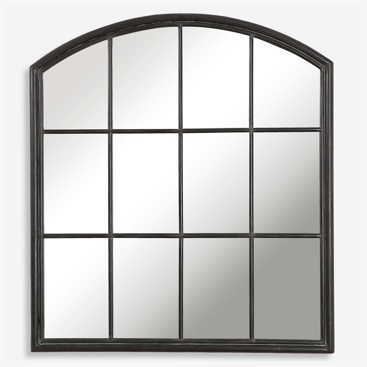 This Arch Top, Window Inspired Mirror Was Created Using Handcrafted Iron That Is Finished In A Rustic Aged Black Accented With Light Gray Distressing.