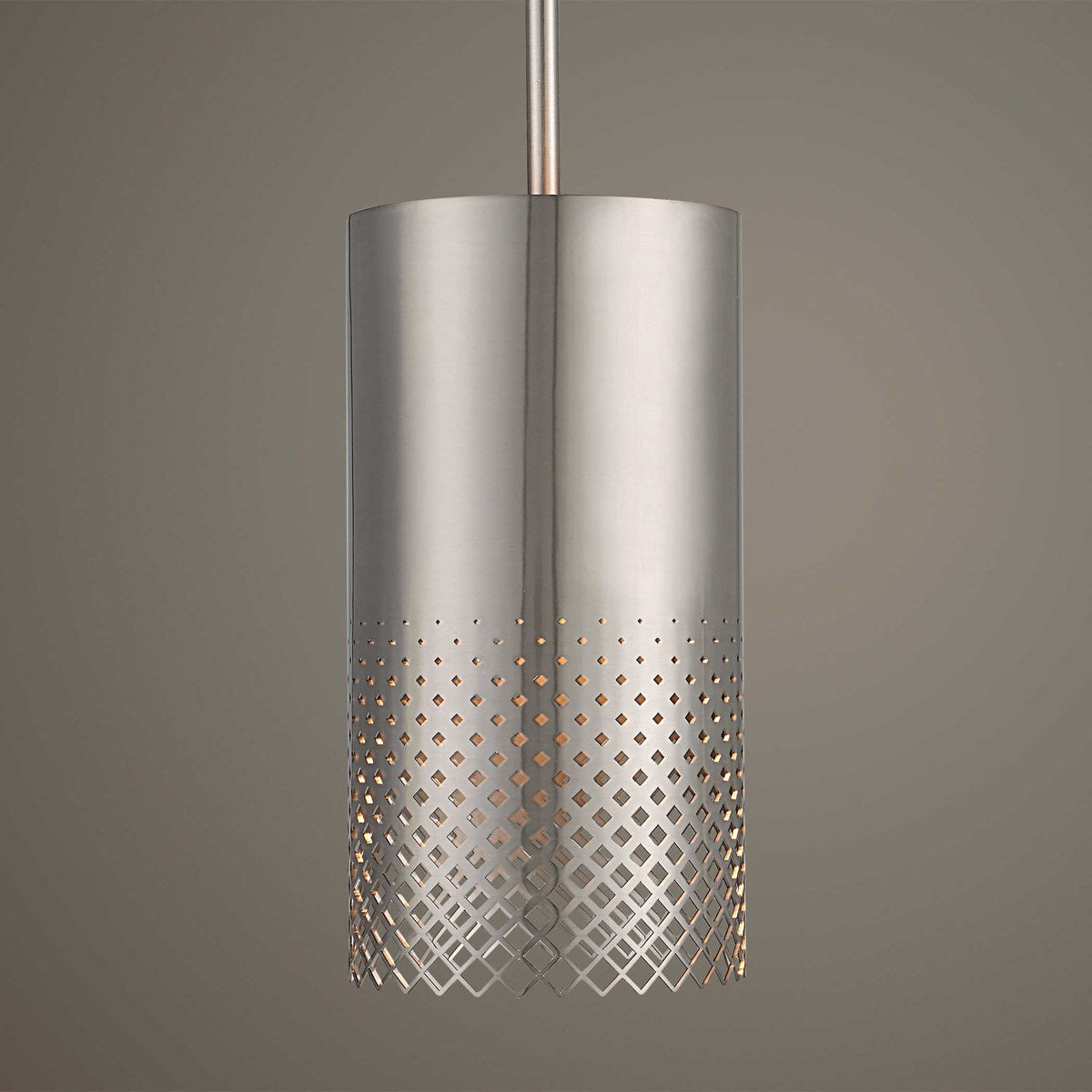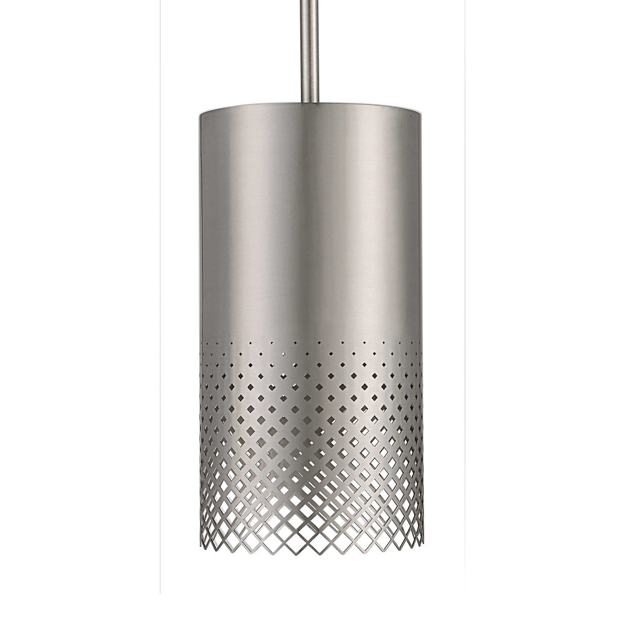 Clean Cylinder Shaped Satin Nickel Pendant With A Unique Laser Cut Ombre Patterned Edge Detail Is A Perfect Fit With Any Modern Decor Look. 1-100 Watt Max Edison Socket. Bulb Not Included. Supplied With 15' Wire, 3-12" Stems And 1-6" Stems For Adjustable Installation.