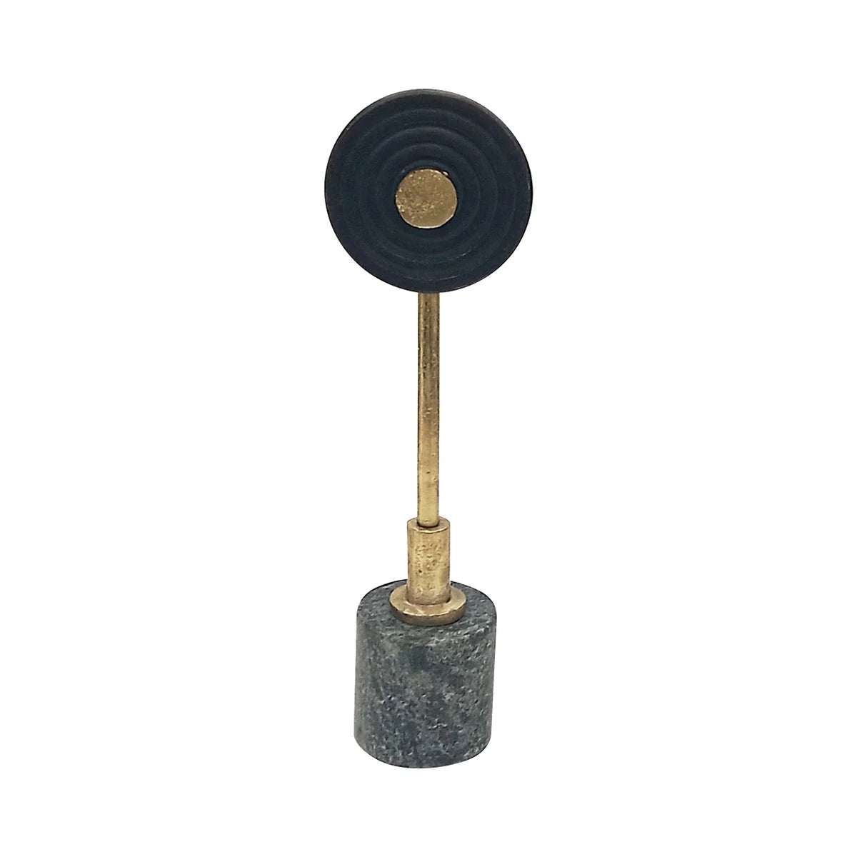 This stylized adaptation is crafted from textured cast aluminum bronze finished disks surrounded by an antique brass center. A matching antique brass stem fixes the sculpture to a cylindrical veslana marble base. With three sizes available in this series, the Mata sculpture is best shown in multiples to create a striking display.