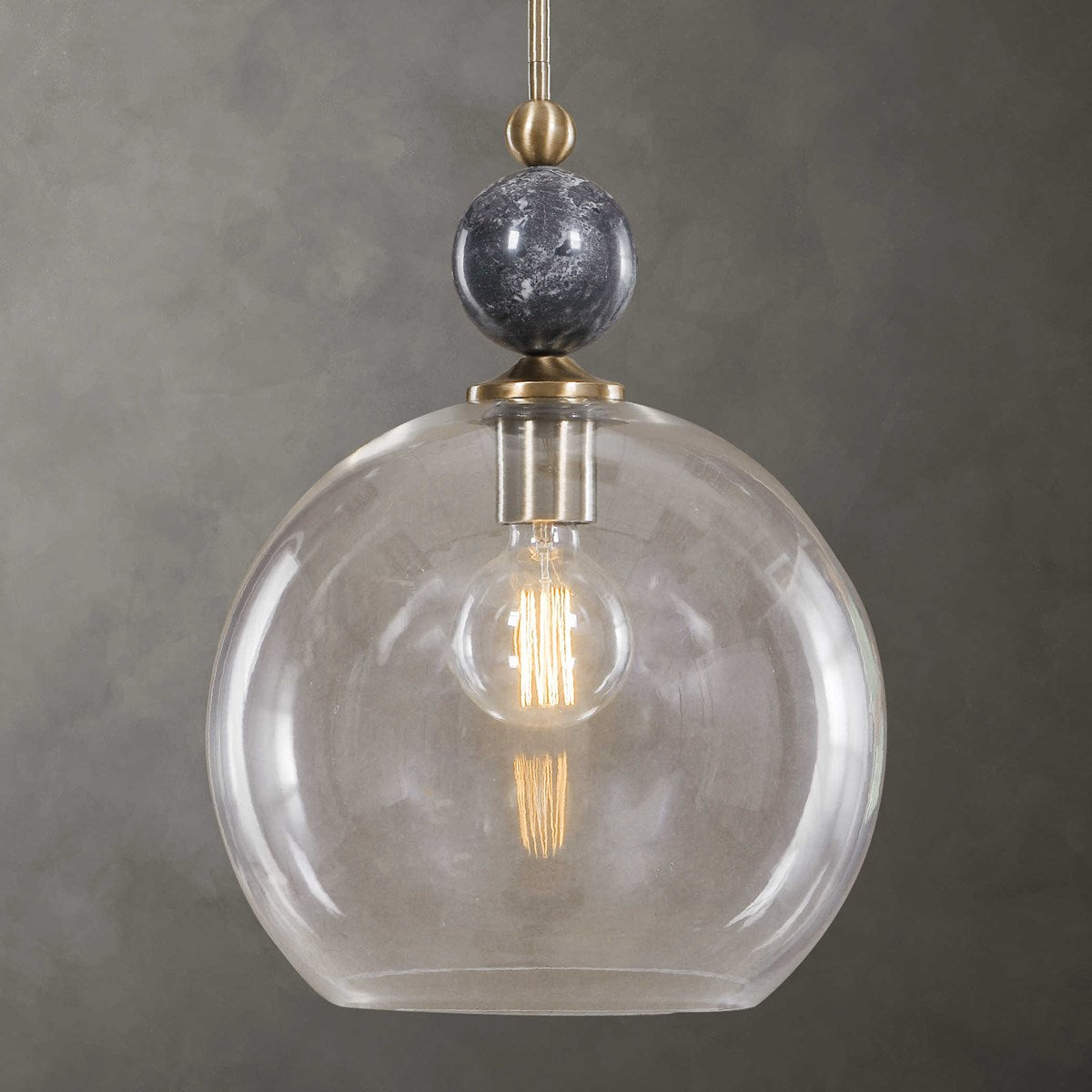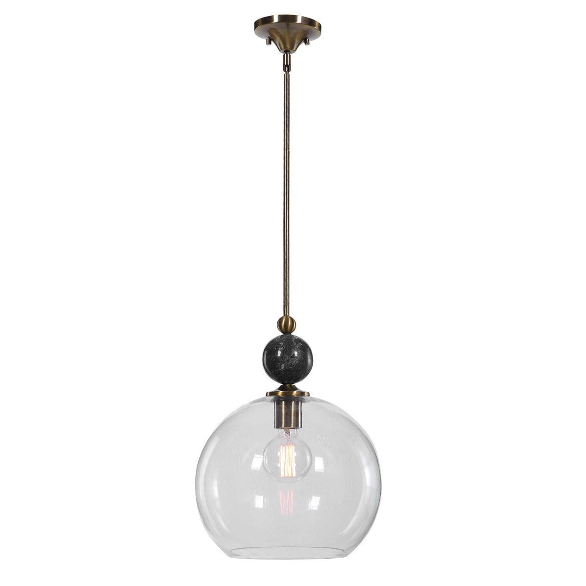 Topped With A Rich Black Marble Ball, This 1 Lt. Pendant Features An Oxidized Aged Brass Finish Enhancing The Simple But Elegant Line. Finishing Off This Look Is A Clear 13" Diameter Glass Globe. 1-60 Watt Max, Edison Socket. Bulbs Not Included. Supplied With 15' Wire, 3-12" Stems And 1-6" Stem For Adjustable Installation.