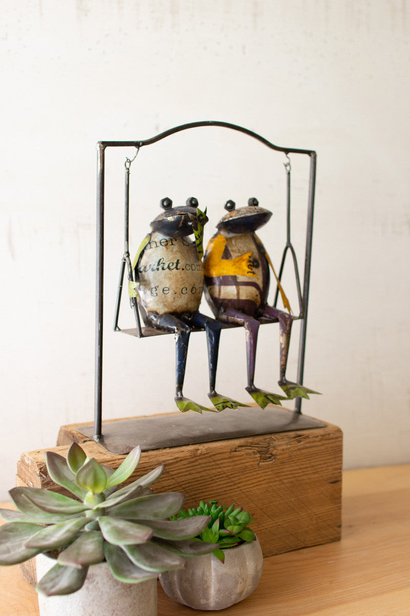 Two recycled metal frogs on a swing.