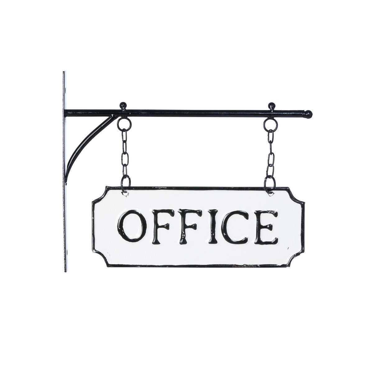 This vintage-style metal office sign with metal display bar features a lightly distressed black and white paint finish. Wall-mount display bar.