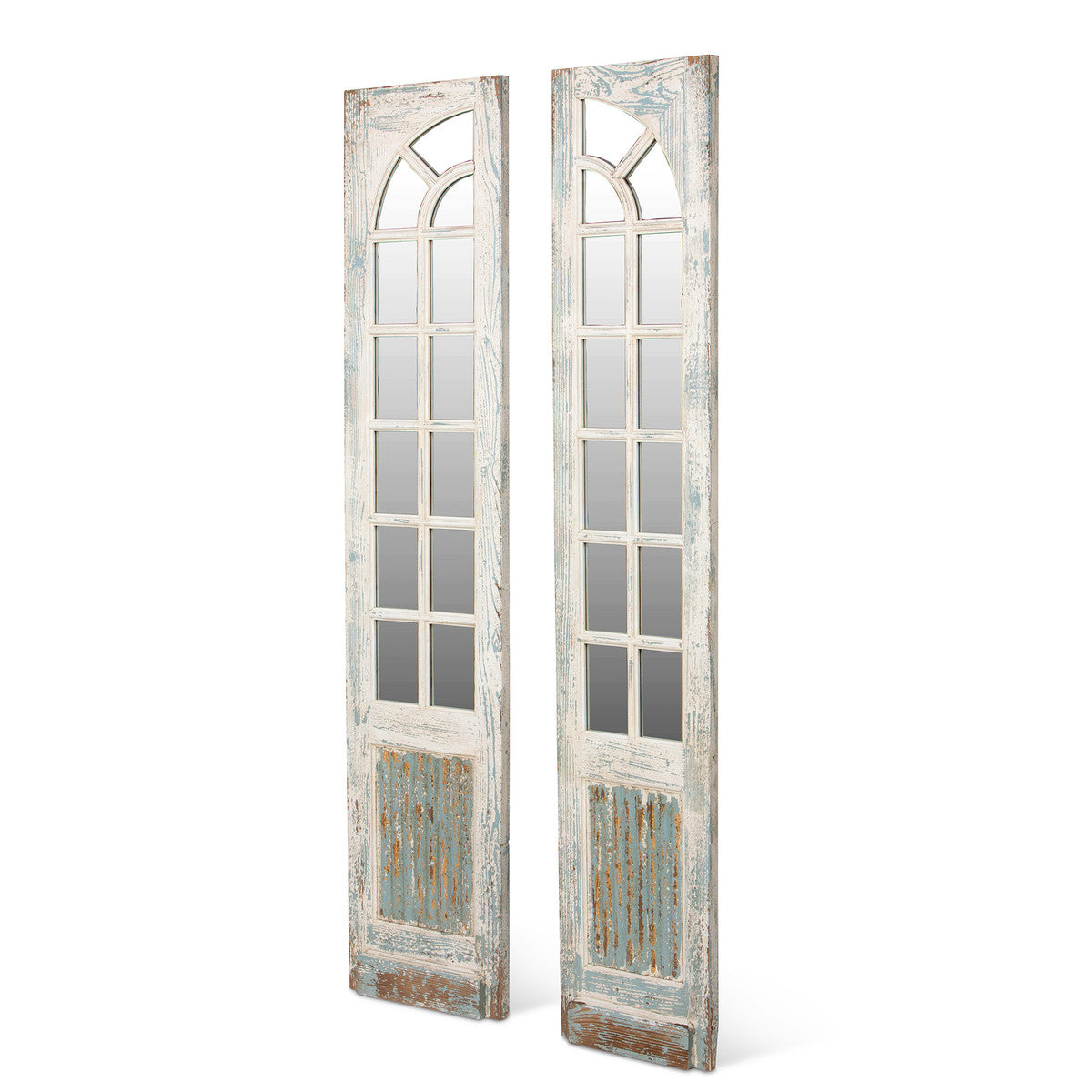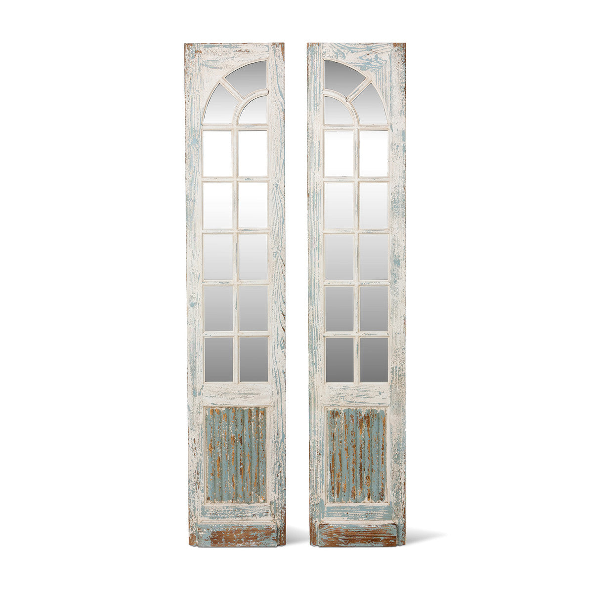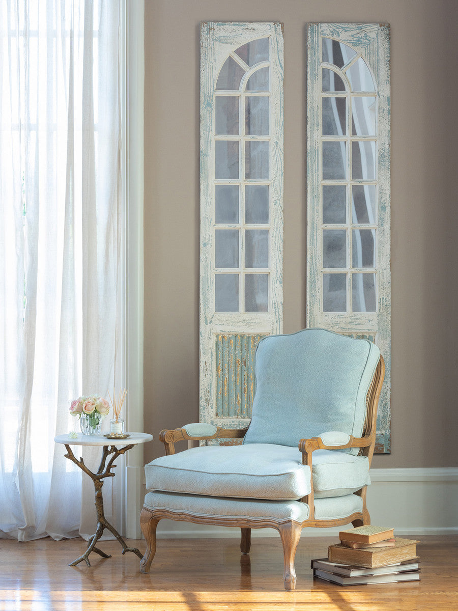 We are refreshing the old shutter look with these Mirrored Sidelights in a set of two. Hang them side-by-side for a large statement or flank them on either side of a console or entryway for a framed look. With complimentary mirror patterns, the sky is the limit with how and where to use these wall hangings. Their white-washed finish allows them to blend with many different styles and the blue highlights keep them current.