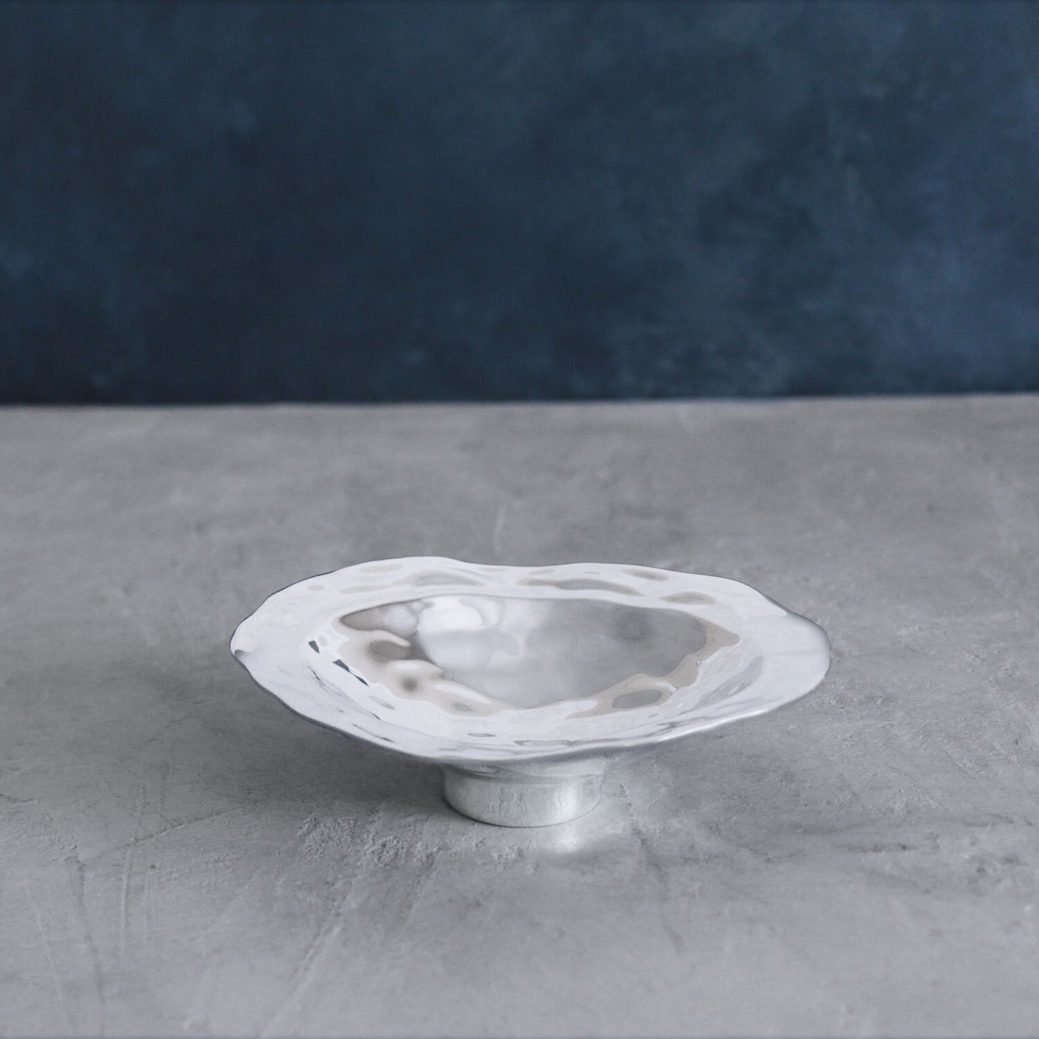 The shimmering Morocco SMALL Oval Bowl is slightly raised on a petite pedestal base, so it seems to hover above the surface of the table. Ideal for snacks or salsa, the bowl's dramatic hammering results in a shimmering surface that allows anything placed in it to shine. Intensely handmade products employ eco-friendly and sustainable materials, and are crafted by artisans who trace a heritage of metalworking for generations. Sustainably handmade of a top quality, FDA safe, easy-care, oven and freezer friendly aluminum alloy